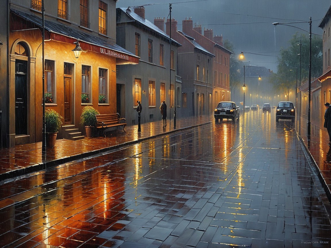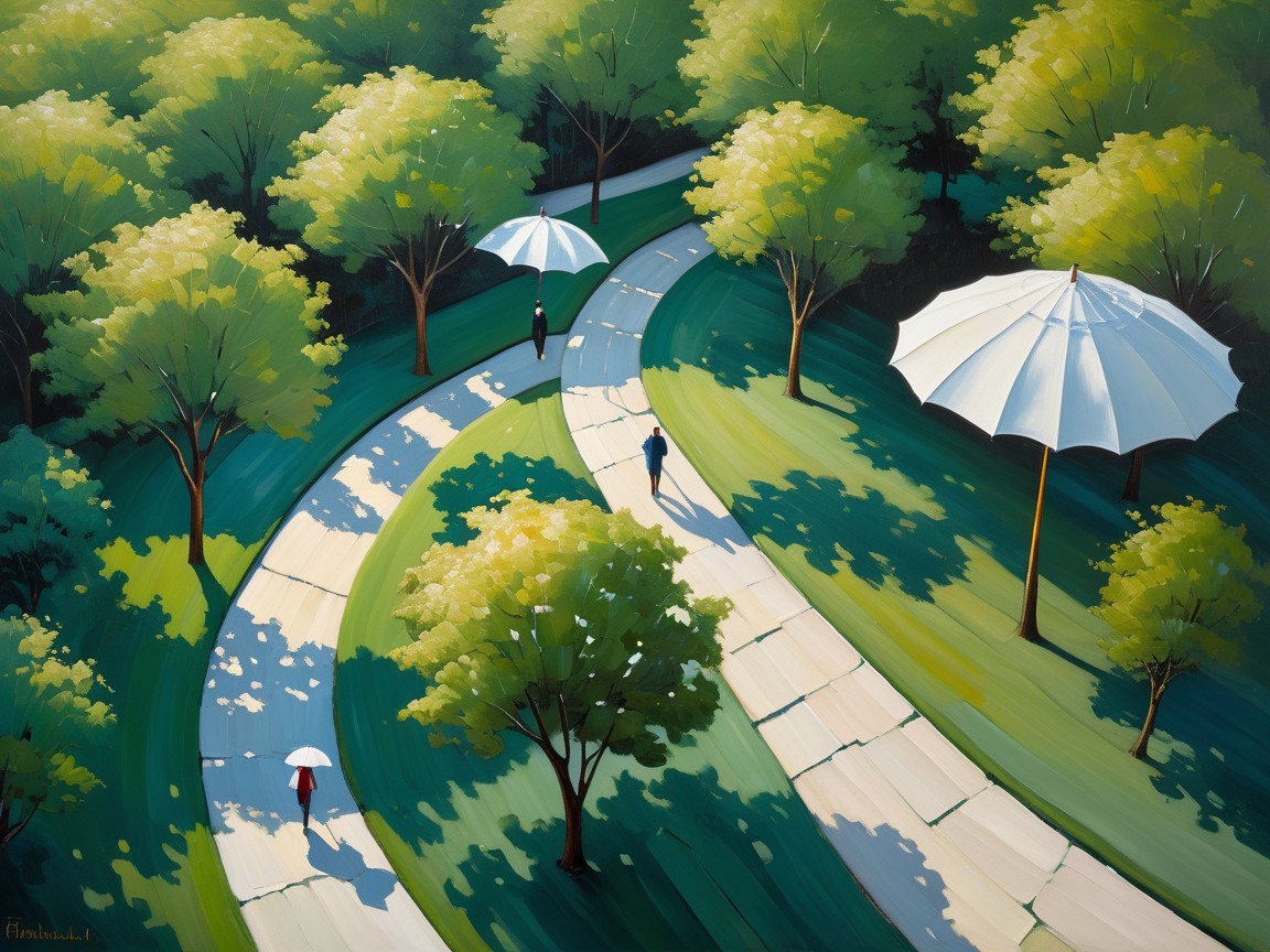 Prompt: A captivating oil on canvas painting, rendered in a stylized, impasto technique and viewed from a high, aerial perspective, showcases a wide, meandering path composed of luminous white hues, upon which a scattering of solitary figures gracefully stroll, each shielded by a delicate umbrella. Flanking the path are abstract trees, their forms suggested by swirling strokes of blue, verdant green, and shimmering gold, while the background is a textured expanse of dirty white impasto, creating a sense of depth and atmosphere. The scene is bathed in warm, diffused lighting, evoking a dreamlike quality and emphasizing the tactile richness of the paint, reminiscent of the works of Van Gogh or Monet. By CrisDeR