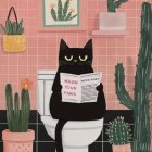 Prompt: gato negro leyendo periódico sentado en el wc, tiene los ojos grandes amarillos, con mirada tierna. La decoración es con plantas y cactus con flores, en macetas de terracota con motivos, y azulejos estilo antiguo rosa. Muy chic