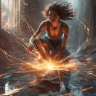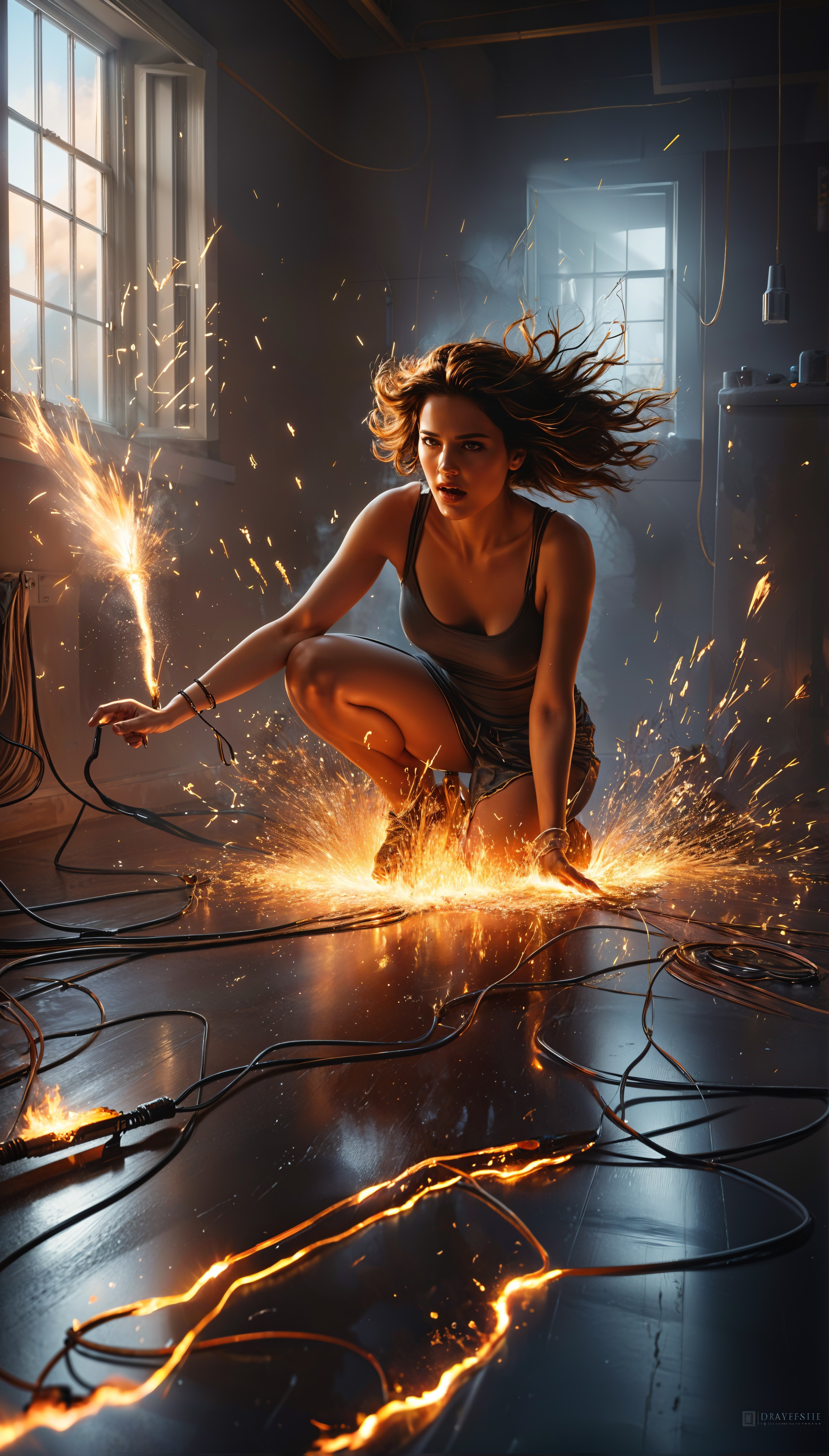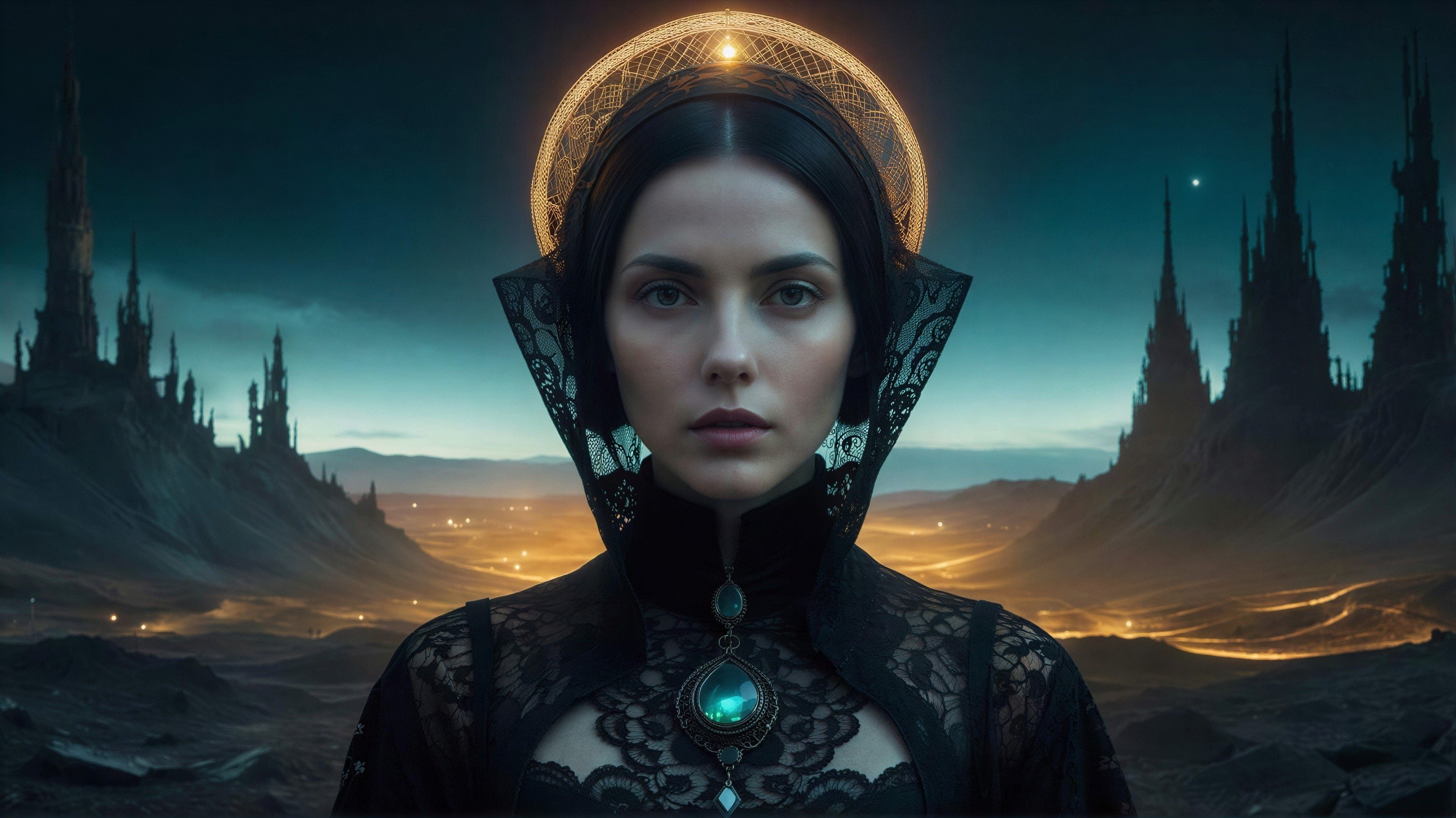 Prompt: surreal portrait of mysterious woman in dystopian landscape,glowing anomalies,distorted elements,she wears whimsical,dark clothing with lace patterns,inspired by Bosch,Goya,immersive dark fantasy atmosphere;highly detailed,8K resolution,hyper-realistic,vertical composition,rich jewel tones,analog errors,databending distortions,dramatic lighting
