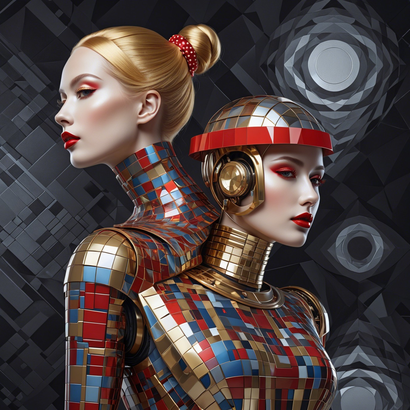 Prompt: Portrait of robot, golden hair, red lips, styled by ,Victor vasarely, with low poly, polka dotted, paisley and striped elements, HQ, 8k, Chrome, metallic bronze brass,