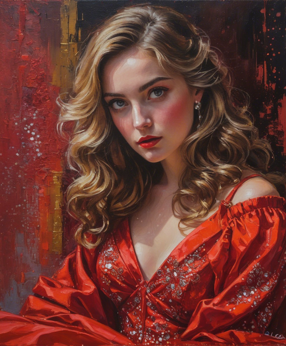 Lexi's woman in red gown, eyes sparkling in soft, natural light, alluring baroque portrait within soft post-industrial feel with delicate reflective dots and metallic accents of far background;