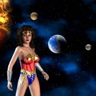 Prompt: Richly detailed oil painting by Bob Larkin depicts very well-endowed Lynda Carter as Wonder Woman standing in space, black wavy hair, red lipstick, gold tiara adorned with red metallic star, shiny red bustier with gold eagle wings design, blue shorts with white stars, wide feminine hips, gold belt, silver arm bracelets. large, fiery sun on the left, and Earth and a moon are in the starry background. The artist's signature "Guy" is in red on the bottom left.