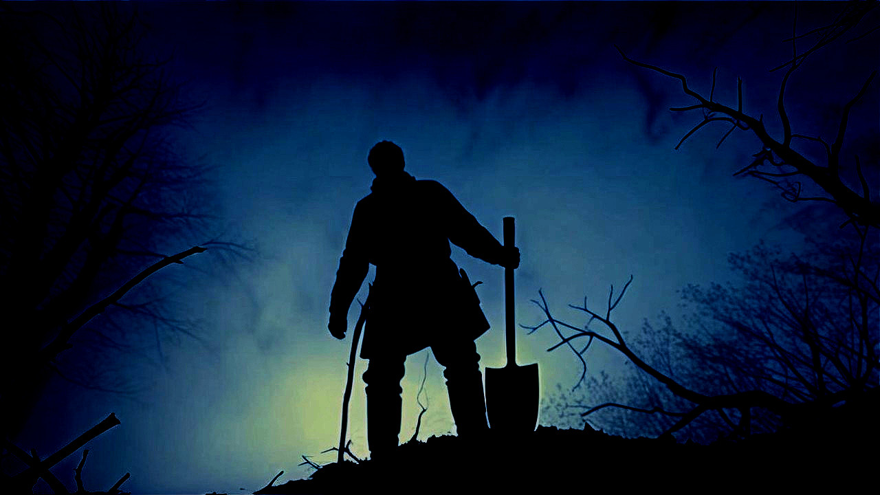 Prompt: A dark, ominous scene viewed from below a figure standing at the edge of a hole or pit, looking down into it. The figure is holding a shovel and is silhouetted against a foggy, pale blue sky with leafless, twisted branches extending into the frame. The overall atmosphere is eerie and mysterious, with a sense of foreboding. The perspective emphasizes the depth of the hole and the threatening stance of the figure, creating a dramatic and unsettling mood.