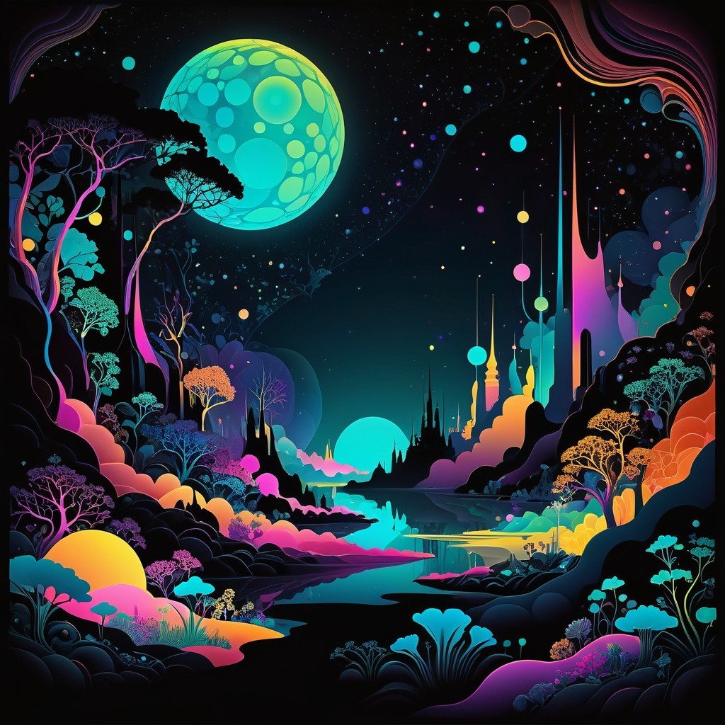 Prompt: surreal alien landscape by Lotte Reiniger depicted in the perfect fractal style of Mandelbrot, Julia, Wassily Kandinsky, Alphonse Mucha, glowing neon colors, dark background