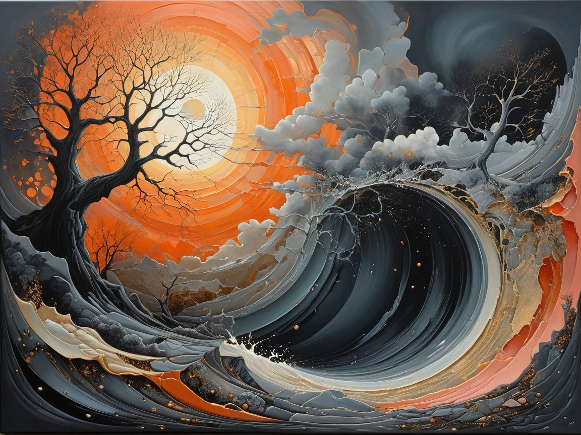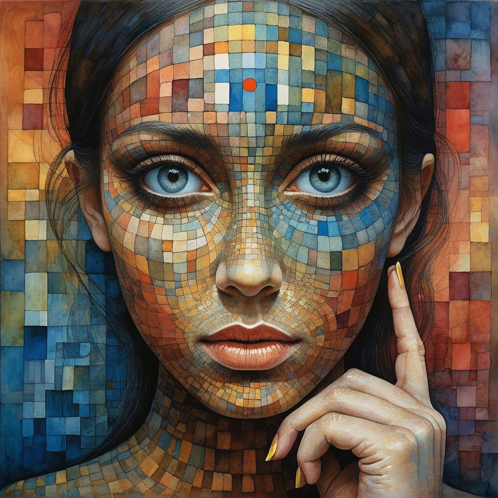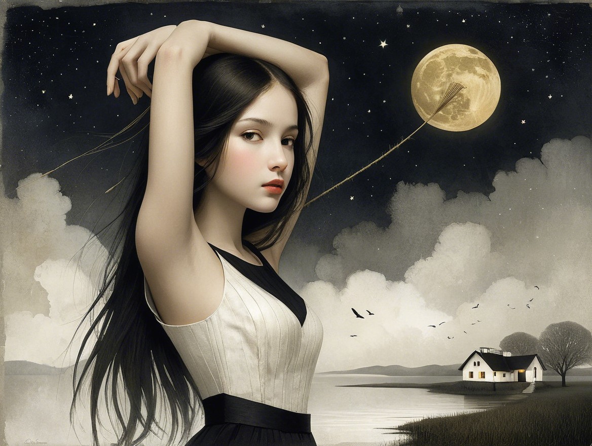 Prompt: Oil enigmatic mystical painting cracked vintage canvas art surrealism with intricate plot raw emotions scene, double exposure effect, cascade of shadows on pachwork painting, bright vibrant torquese, dark grey, ivory and light coral colors and step gradien hues, gold dash inclusions, concave lens light, mystical illusion, remeniscent mystical style and colors of Catrin Welz-Stein, Igor Maykov, Zdzisław Beksiński, Meghan Duncanson, and Yayoi Kusama, mixed media unique technic A serene, ethereal composition of a ethereal beauty woman with flowing hair blending effect into a dreamy fantastic unparallel twisted fade shows unclad crotch breast with unreal mirage dreams partially dissolving in the silver web of the wind. Her eyes reflect tranquility, while a sunset casts soft colors over distant timeless enigmatic reality. accent silver ink outlines, stained blur colors, extremely detailed, high definition, crisp quality, ultra detailed background, 8k perfect composition, dramatic, insanely detailed dripping torquese droplets, dreamy reality, Ink Drawings by Greg Olsen, Patrice Murciano, Artgerm, Carne Griffiths, Andrew Atroshenko, WLOP, Anne Stokes, vibrant deep colors, hyper-detailed, intricately detailed body, frontlight, the focus is on the cracked textures and the 3-dimensional highlighted figures of the woman and the moon that appear like a mixed media collage mosaic tiles elements with smooth corners, silver lace framefork. Soft light illuminates the dreamlike scene. trending on Artstation fantasy ethereal hdr Picasso Van Gogh acrylic art Mixed Media Gustav Klimt impasto Surrealism vibrant colours celestial 3D shading Uhd enchanting enigmatic richly textured Starry night sky 3D relief grunge texture metallic gold overlays Odilon Redon and Luis Royo, evoking a dreamlike atmosphere Full shot full body view