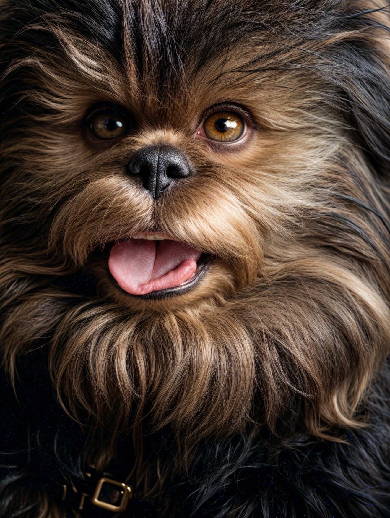Prompt: Close-up image of a furry baby wookie with larger-than-life soulful eyes, gloriously fluffy and richly-colored fur in shades of black, gold, brown and grey. Though cute and fuzzy, the wookie’s eyes look with intense interest at the viewer with a mischievous curl to its thin dark-brown wookie lips. Son of Chewbacca.