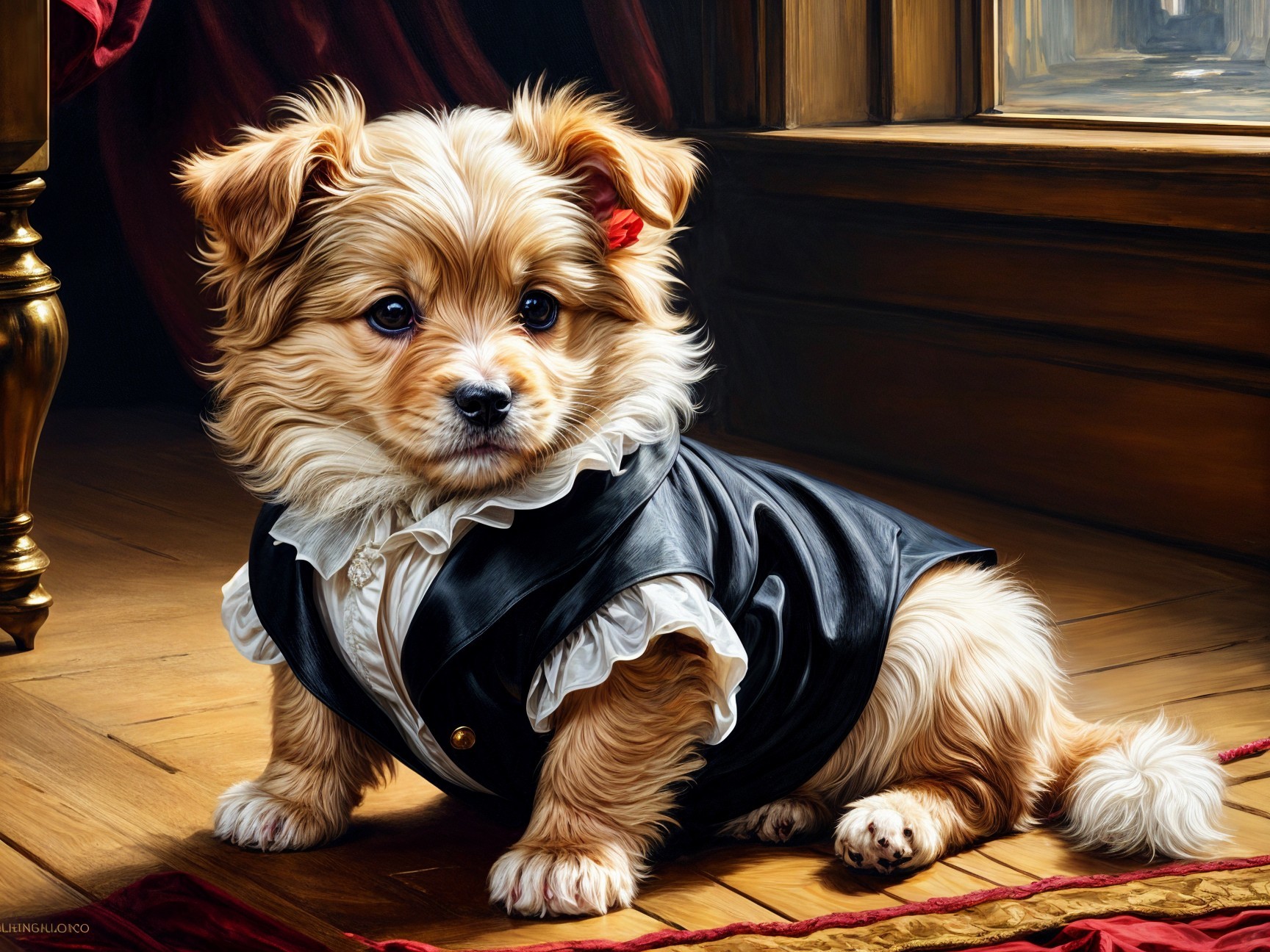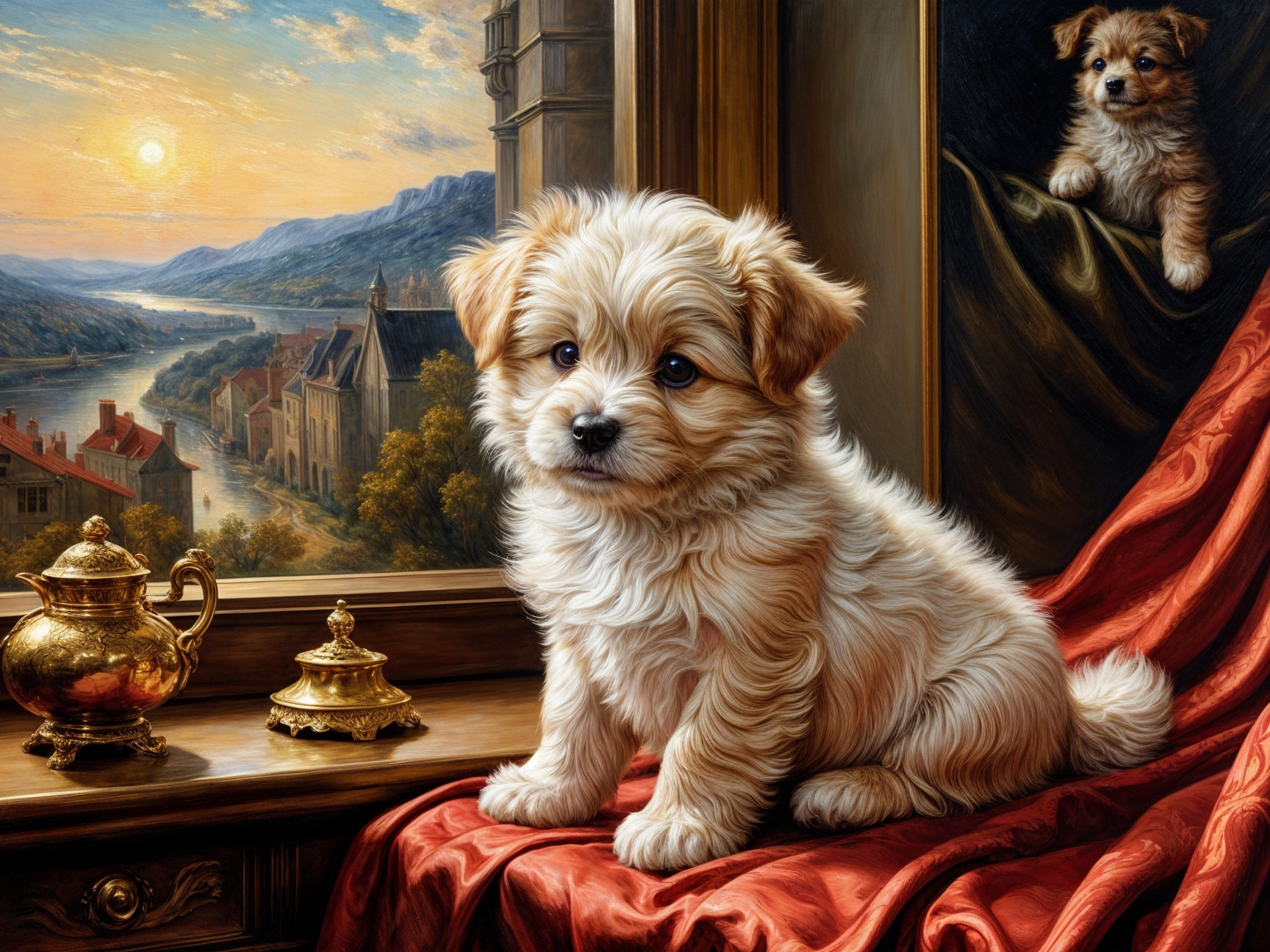 Prompt: Cute fluffy puppy , The style is Neo noir , sentimentalism ,elegant, Impressionism , Peter Paul Rubens , Diego Velasquez , Auguste Renoir , vintage, oil, masterpiece, high detail, art station
