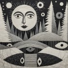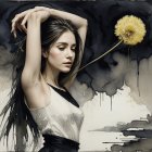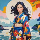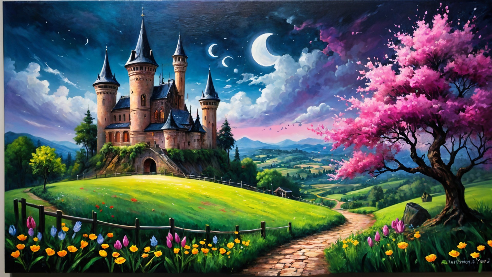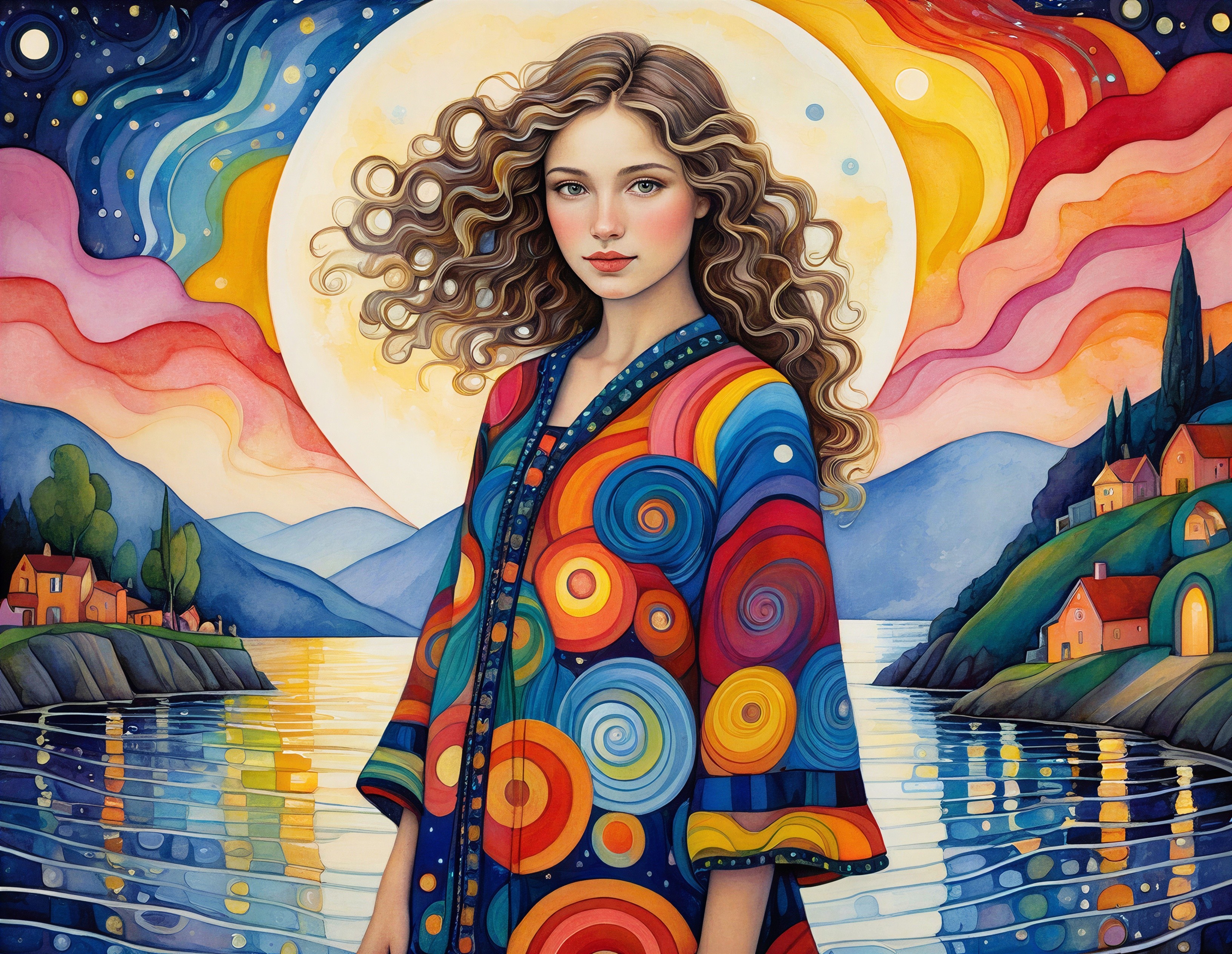 Prompt: (a splendid masterpiece) , (A glorious girl with wavy hazy hair gazes thoughtfully. She wears a colorful garment, and vibrant patterns swirl around her, set against a backdrop of whimsical starry night and a scenic landscape), By Hundertwasser, The piece should evoke a sense of wonder and awe, utilizing techniques reminiscent of colorful pencil sketch, Ink and watercolor painting. Full Length Image.
