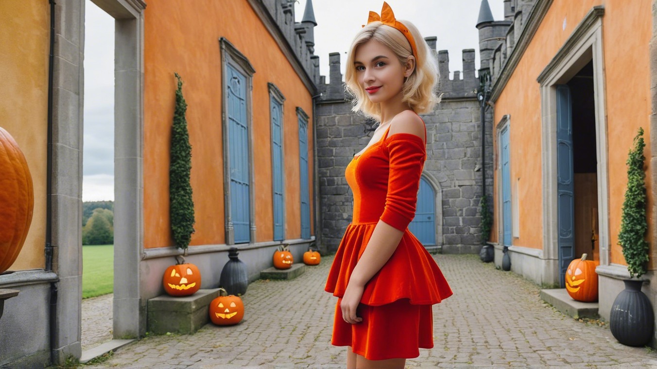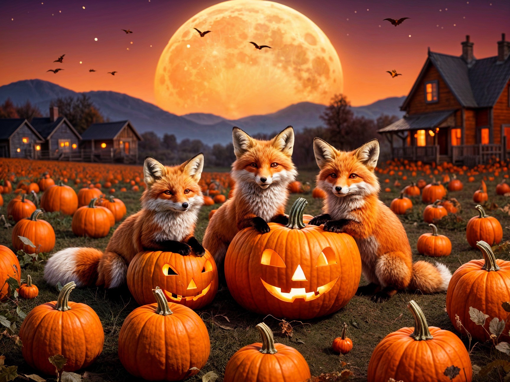 Prompt: Fluffy fox family playing in a pumpkin field at twilight, illuminated by the soft glow of the moon, vibrant orange pumpkins scattered around, children in costumes interacting with the friendly foxes, whimsical and magical atmosphere, autumn colors of orange, brown, and gold, mystical setting, dreamy and enchanting, digital illustration, detailed fur textures, playful expressions on the foxes and children, warm ambient lighting, Artstation.#children #friendly foxes #glowing moon #pumpkin field #twilight