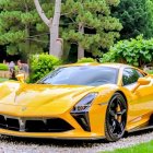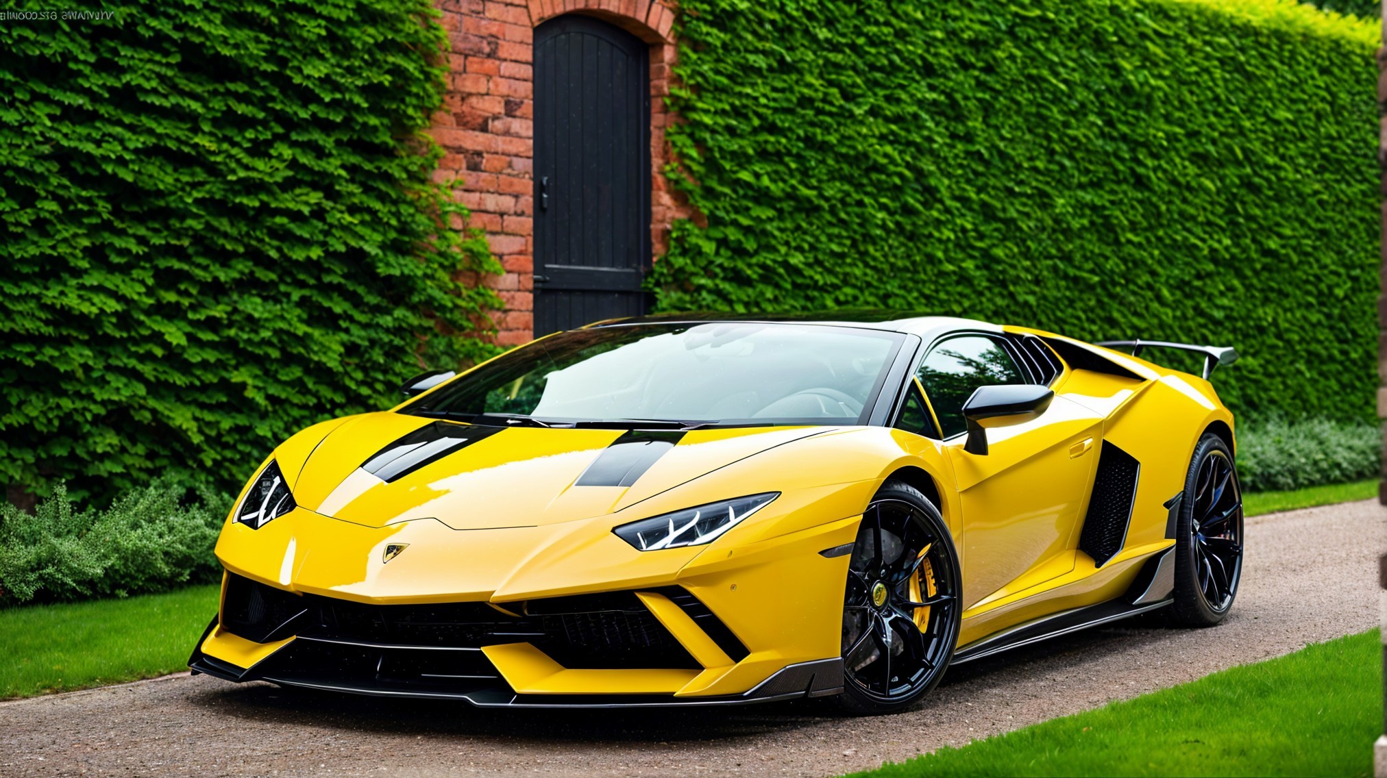 Prompt: 2023 Lamborghini Revuelto, Perfect, glossy yellow painted, bold glossy black racing stripe from the center to the back, chrome finished, parked, background is lush green foliage and a brick wall, Perfect, 32K Resolution