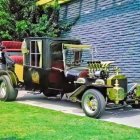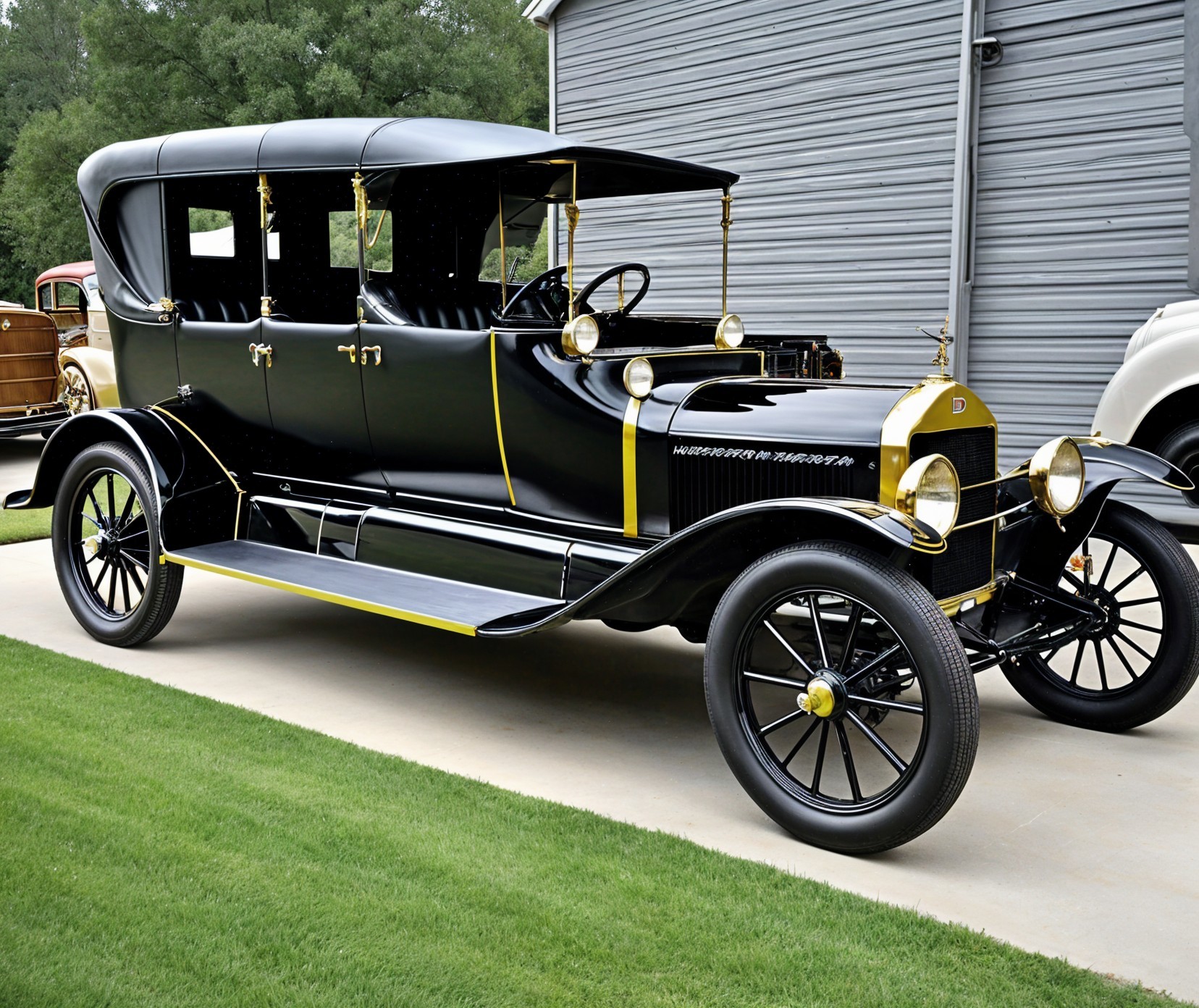Prompt: The Munster Koach, Perfect was constructed from three spliced Ford Model T bodies, with a custom hearse body on an 18-foot-long chassis, hand-formed brass radiator and fenders, hand-formed ornate rolled steel scrollwork, powered by a 289ci Ford V8 engine, from a Mustang GT, Dropped front axle, split radius rods, and Model T springs, Black pearl paint, A blood-red velvet interior with a four-row seating arrangement, 10 individual carburetors and chrome intake stacks, 4-speed manual transmission, Ford 9-inch rear end was installed, exhaust pipes, Large front carriage lamps, Mag Wheels on the front, large drag slicks on the rear, Perfect, 32K resolution