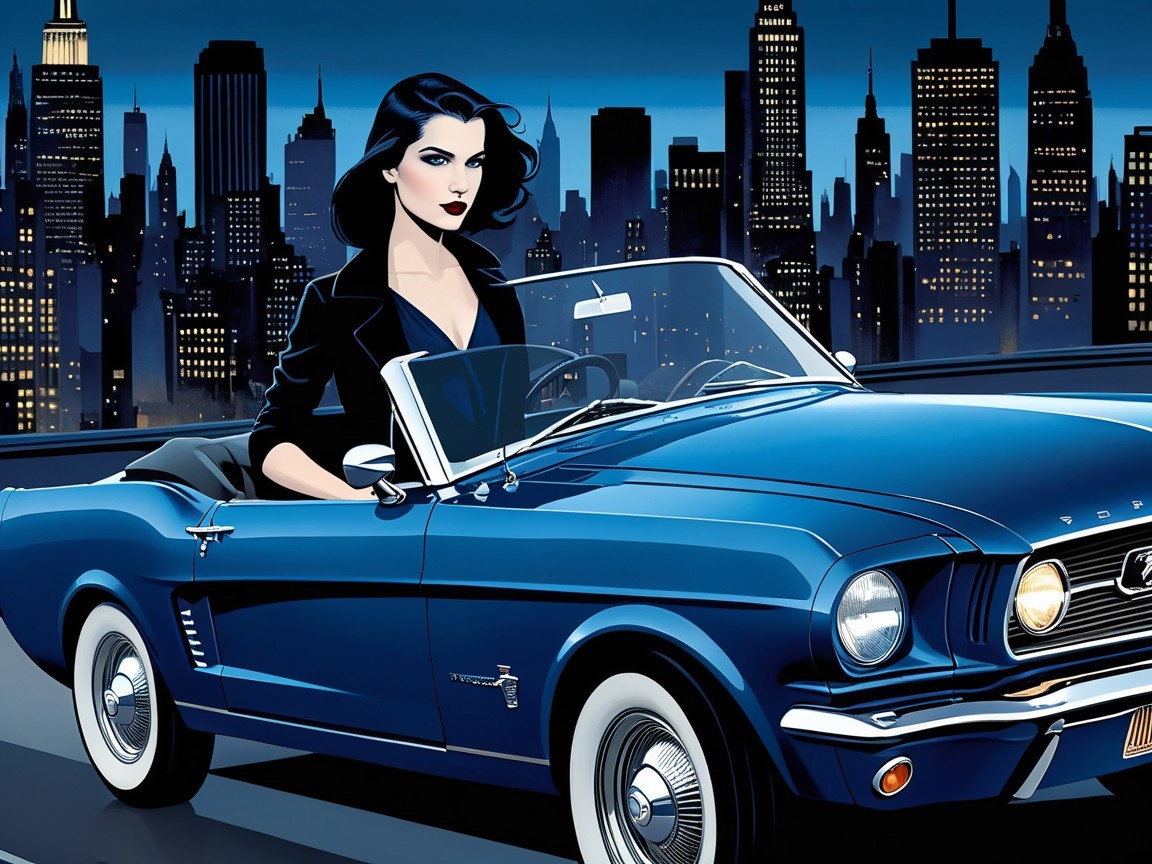 Prompt: An Art Deco Female Teenage Vampire driving a Ford Mustang. The background is the Manhattan skyline and the colors are all blues, dark blues, greys and blacks