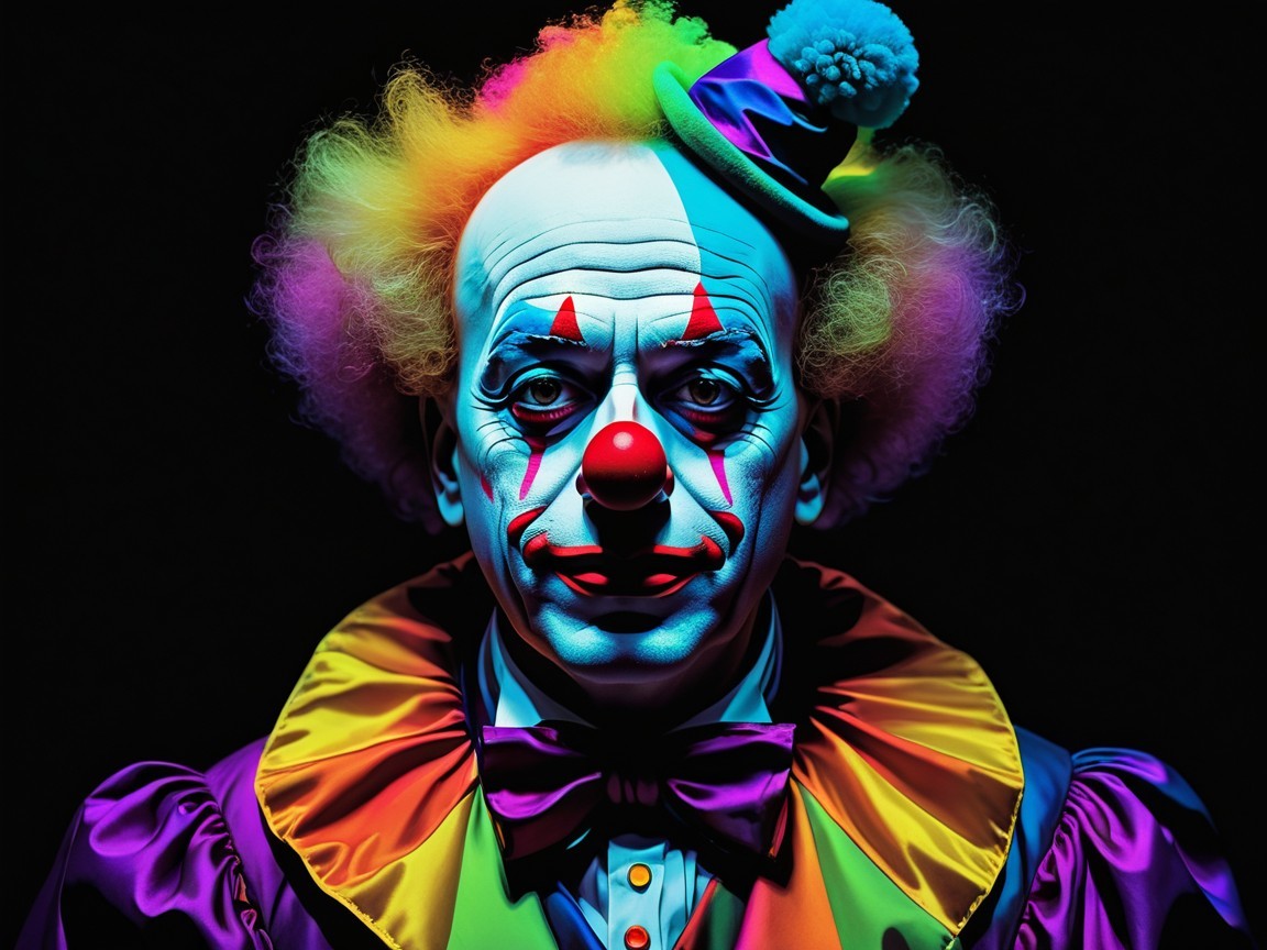 Prompt: surreal portrait of a sad clown by Lotte Reiniger depicted in the perfect fractal style of Mandelbrot, Julia, Wassily Kandinsky, Alphonse Mucha, glowing neon colors, dark background