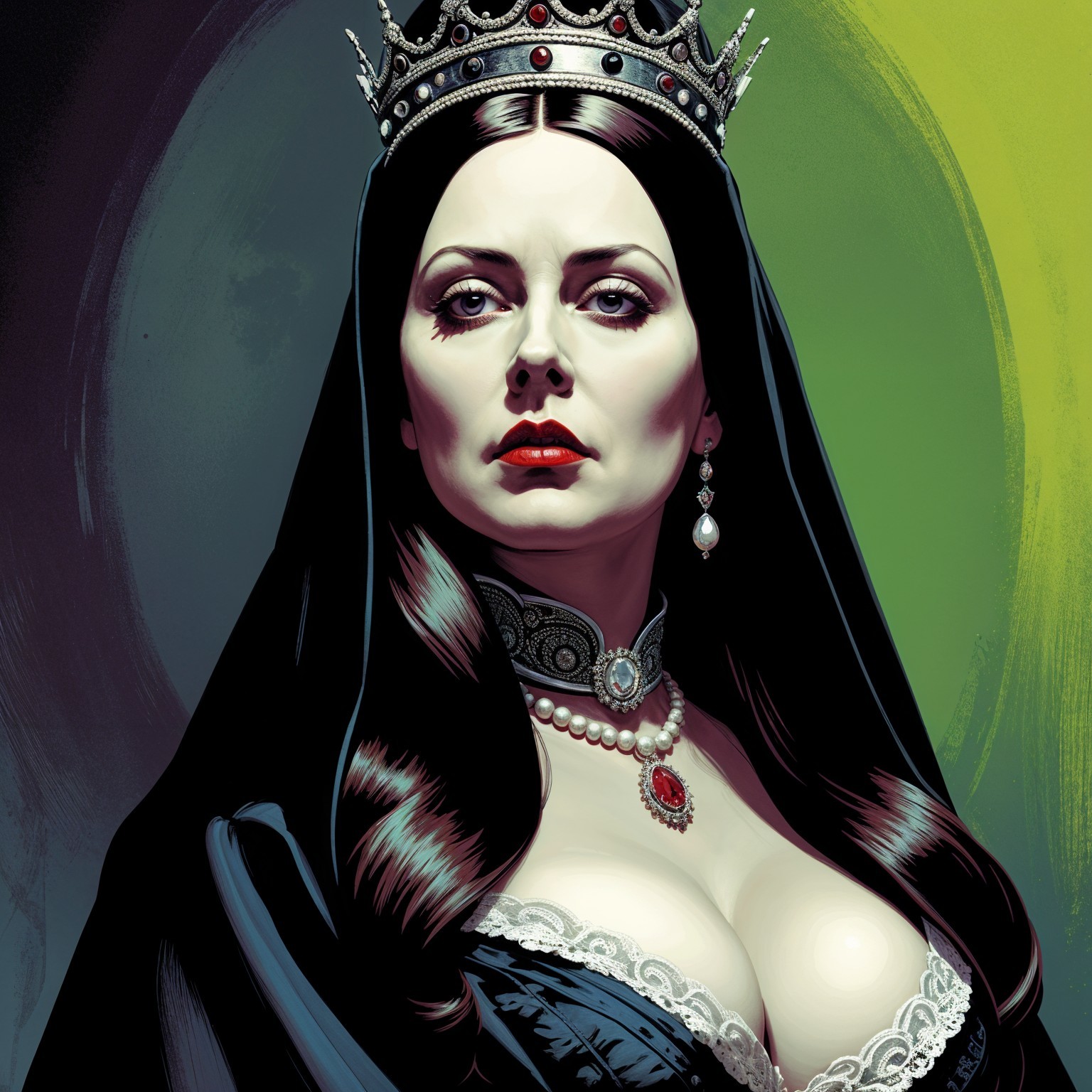 your subject embodies the quintessence of poise and sophistication, exuding an aura of self-assurance, as her piercing, emerald-green eyes seem to gleam with a subtle hint of mischief. her raven-black hair cascades down her alabaster skin like a waterfall of night, framing a face that boasts high cheekbones, a pert nose, and a plump, rose-petal pink mouth that curves upwards in a sly, enigmatic smile.