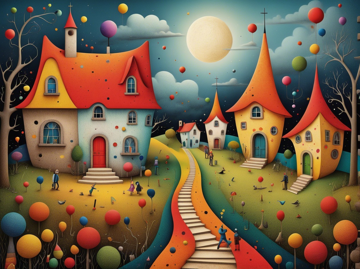 Prompt: (A masterpiece of unparalleled excellence), (("A whimsical, colorful scene featuring oversized, surreal architecture with vibrant staircases, quirky characters in playful outfits, and a giant, expressive face that dominates the space". 3D View, Ultra detailed, High quality rendering, Colorful complex stipple texture)), Inspired by the style illustrations of Joan Miró, Beksinski, Tomasz Setowski, Jacek Yerka, Amanda Clark, Aubrey Beardsley, Josephine Wall. (Full Size image).