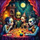FriendsWithYou, Takashi Murakami, KAWS, Yayoi Kusama, Superflat collective artists: ((A COUPLE OF TINY SMART Skeletons)) Celebrate Autumn's, October Feast, PAINTERLY, WATERCOLOR AND INK, WET ON WET, in Whimsical Charming Background, don't forget the forgetmenot bouquet ((with BATS AND PUMPKINS)), PAINTERLY, MAKE IT ABSTRACT AS FAR AS POSSIBLE