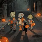 Prompt: Three little Patchwork, Geometrically oddities and their cat out for a Ghoul-tastic Trick or Treat, Mute colours: orange, grey, beige, black, amber hues