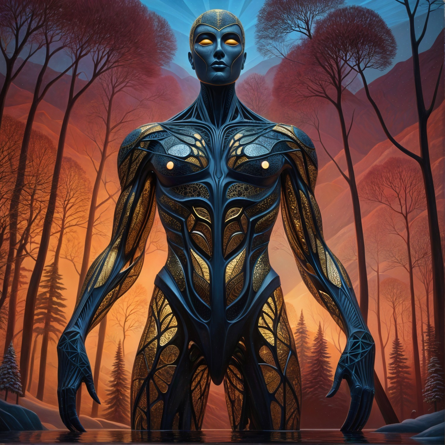 Prompt: winter scene of spectacular mountains and lake, high detail & intricate art, Henri Rousseau, 3D, full spectrum camera effect, blue, gold and slate grey colour scheme, voronoi structured art.