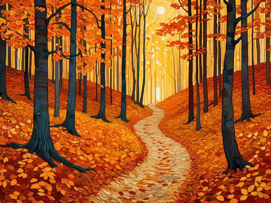 Prompt: FIRST AUTUMN lights in the wood where leaves are dancing, style klimt and van Gogh, zentangle. A serene path winds through a vibrant autumn forest. Trees with fiery orange leaves frame the trail, while golden light filters through, creating a warm, magical atmosphere.