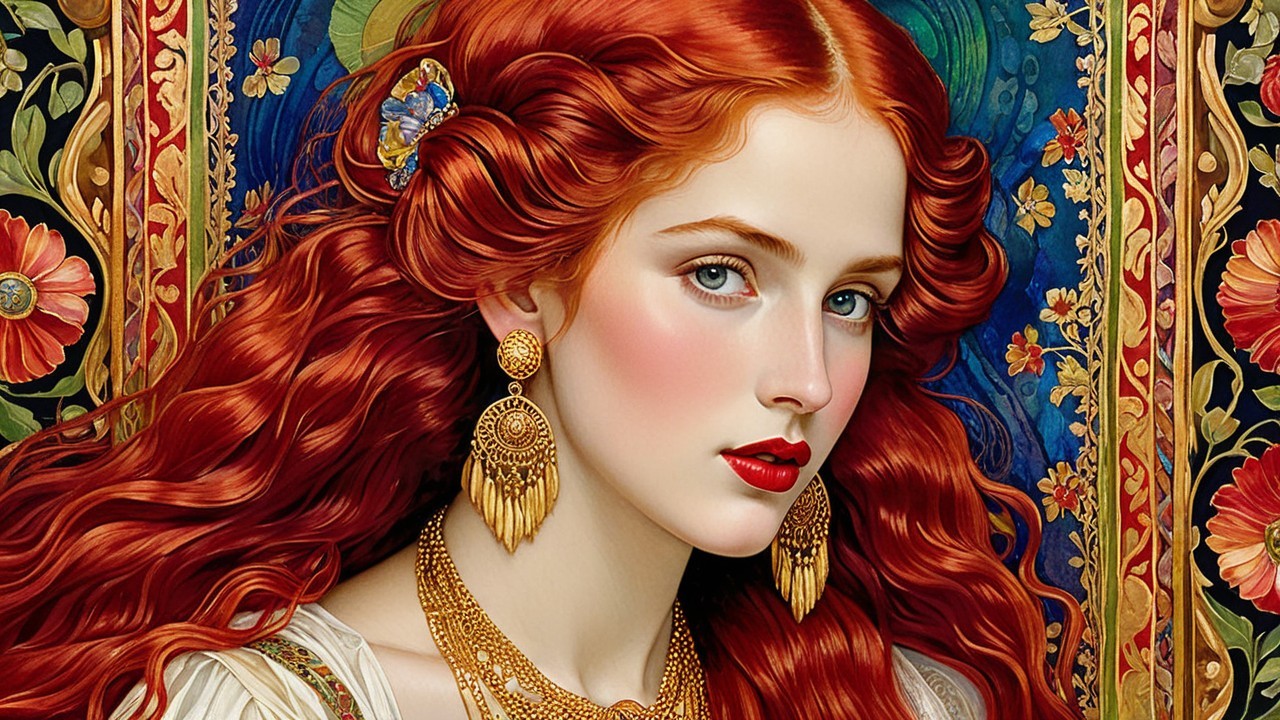 Prompt: Klimt painting of a beautiful pre-raphaelite gypsy with long red hair and large earrings looking at the viewer with mesmerizing eyes as she turns around swinging her lace-trimmed, fringed scarf. silk iridescent texture in watercolor and ink, dark red lips, vibrant colors with gold foil detail, in the style of William Holman Hunt, Tomasz Sętowski, Enki Bilal, Vladimir Fedotko, Pietro Annigoni, Milo Manara, Botticelli, Catrin Welz-Stein, Jean Metzinger, Klimt, by Susanne, perfect eyes, perfect face, anatomically correct hands, highly detailed, paint splatter, dynamic pose, indigo blue backgroun