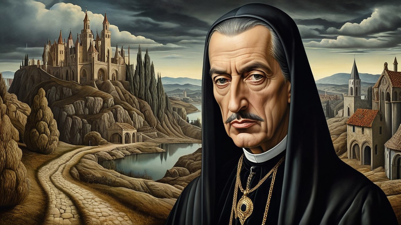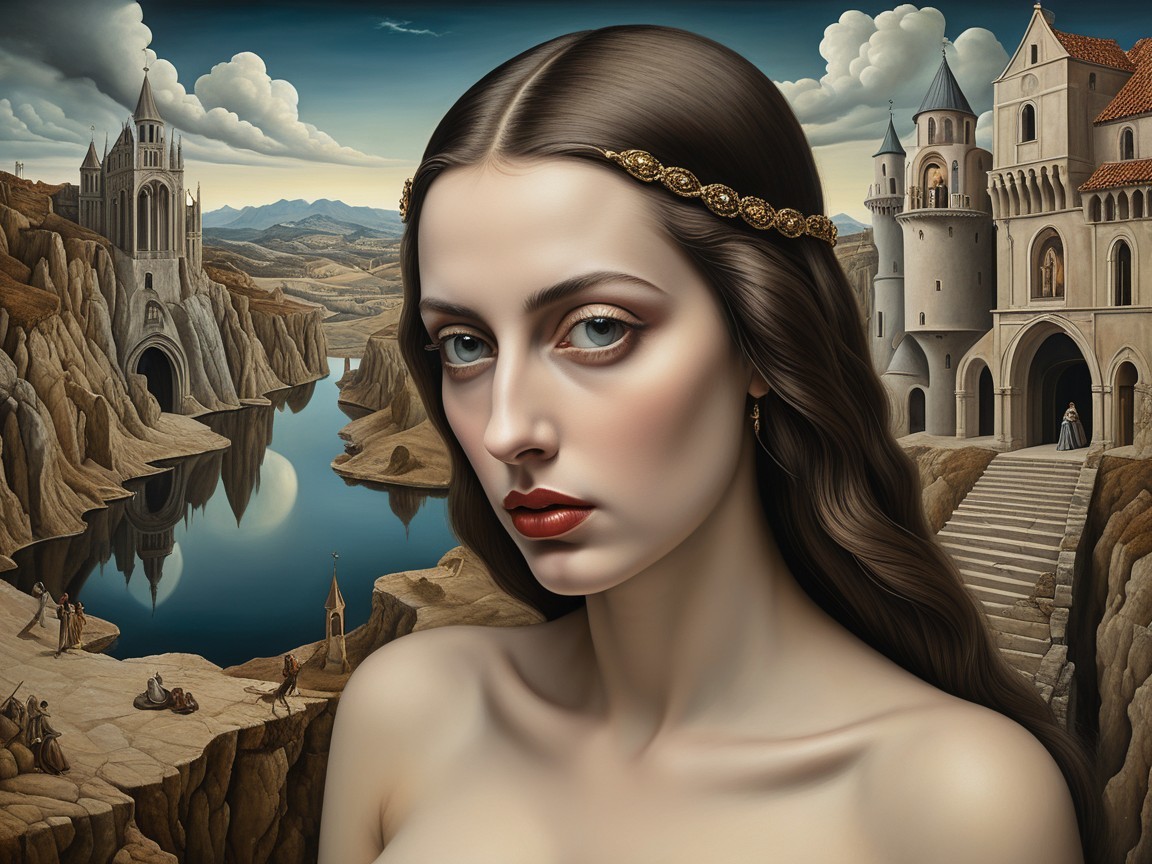 Prompt: Dream Temptation of medieval artist in land of nightmares and evocation, renaissance and medieval style; surrealistic close-up portrait and background landscape inspired by the works of El Greco, Dali, Yacek Yerka and Rene Magritte