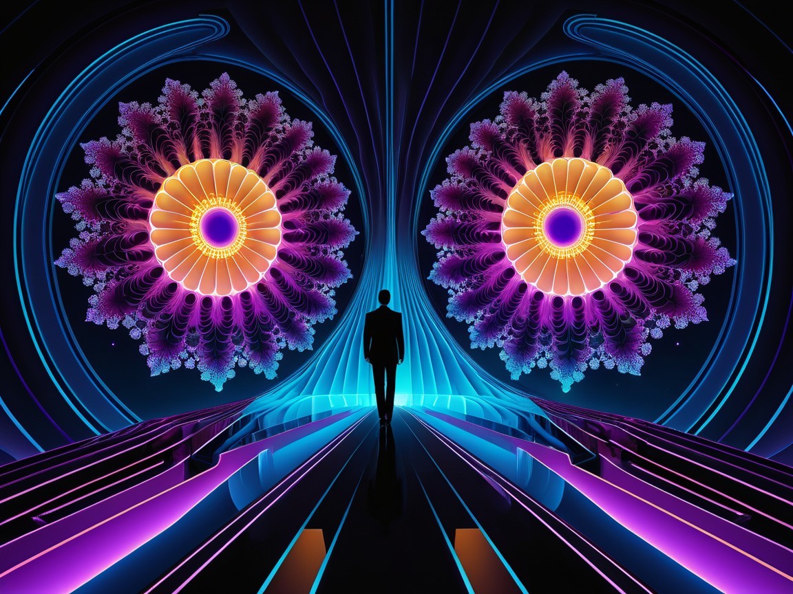 Prompt: A minimalistic illustration of deacy and roth, depicted in the fractal style of Mandelbrot and Huy Duyhn. Glowing neon colors illuminate the scene, set against an art deco background reminiscent of Mackintosh. The composition is clean and precise, highlighting the intricate beauty of the natural process. The overall effect is both scientific and artistic.