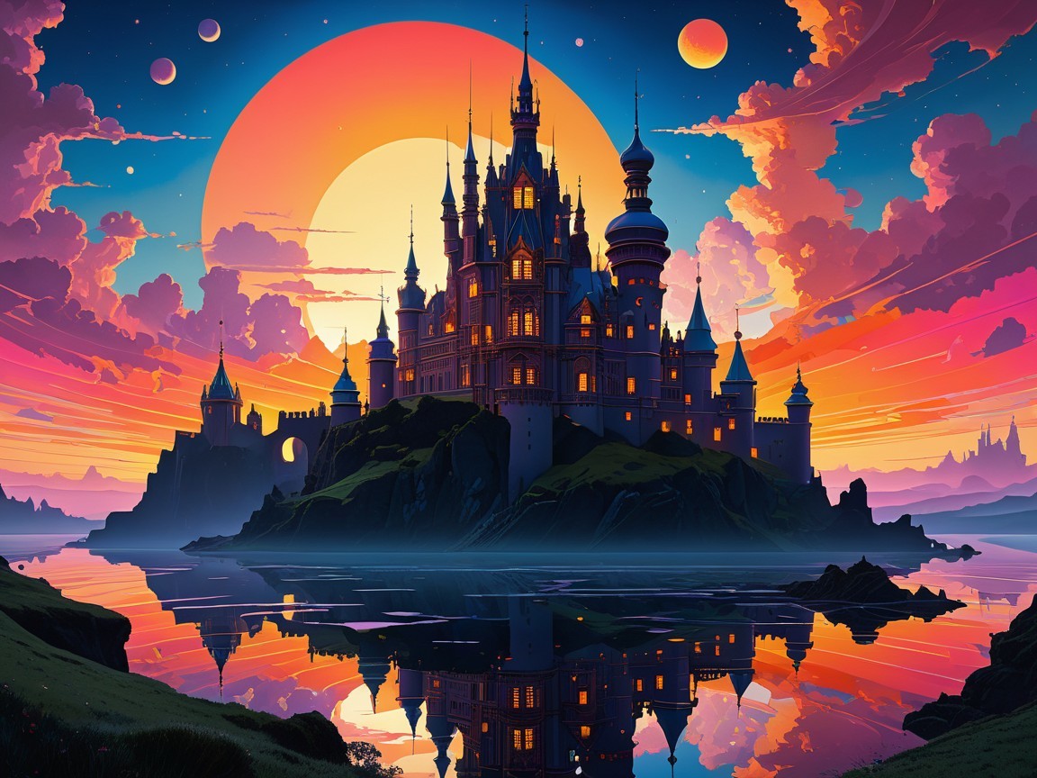 Prompt: epic Impossible baroque castle by Jean-Baptiste Monge and Lotte Reiniger depicted in the perfect fractal style of Mandelbrot, Julia, Wassily Kandinsky, Alphonse Mucha, glowing neon colors, dramatic skyscape at dawn
