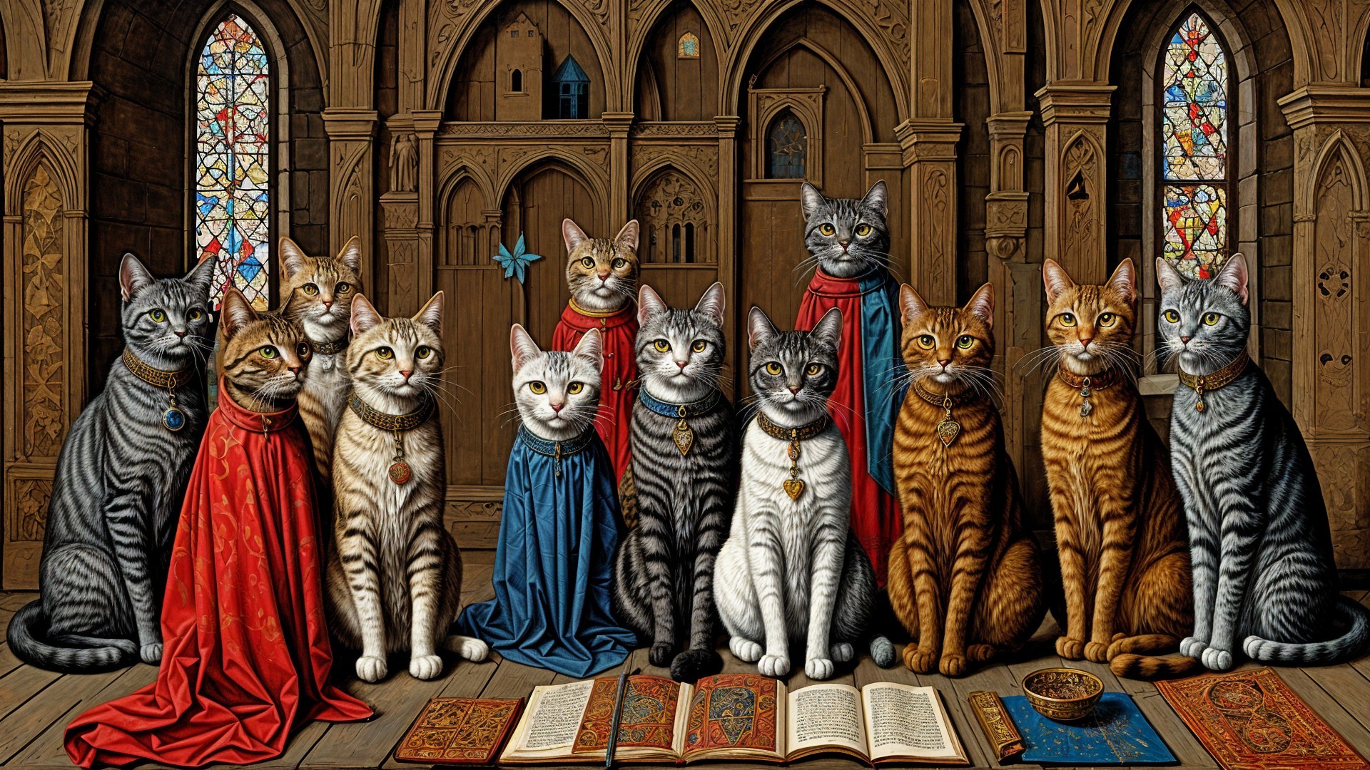 Prompt: digital painting with structural strokes "Cats in the middle ages: what medieval manuscripts teach us about our ancestors’ pets." grungy. Oil painting by Horace Pippin, Gustave Moreau. mixed media: combines elements of a portrait, still life and landscape, forming a poetic image. a riot of patterns, colors, and textures. intensified colors and a simplified design.