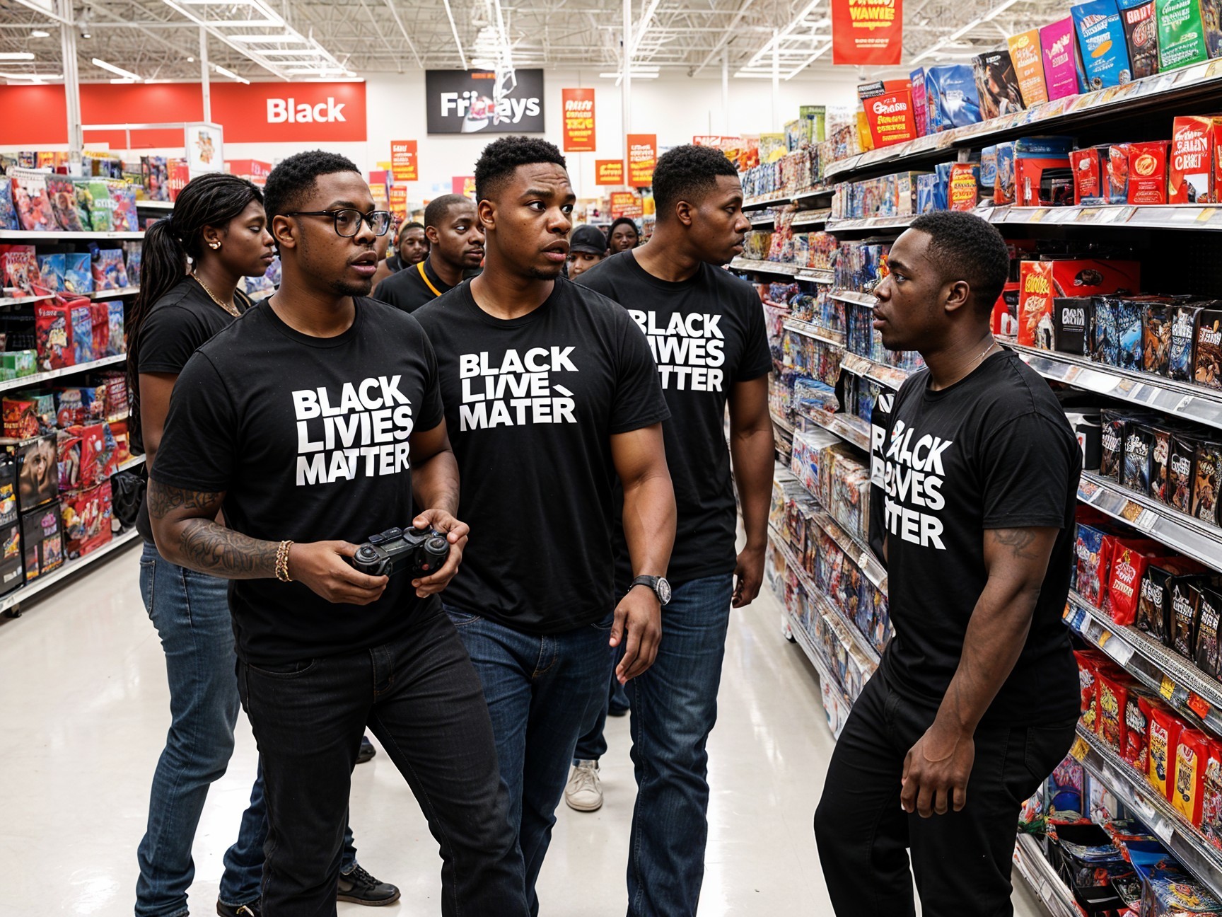 Prompt: Black Fridays Matter Black Lives Matter Black Friday Sales Riot at the Walmart People fighting over boxer briefs and home appliances and video game systems