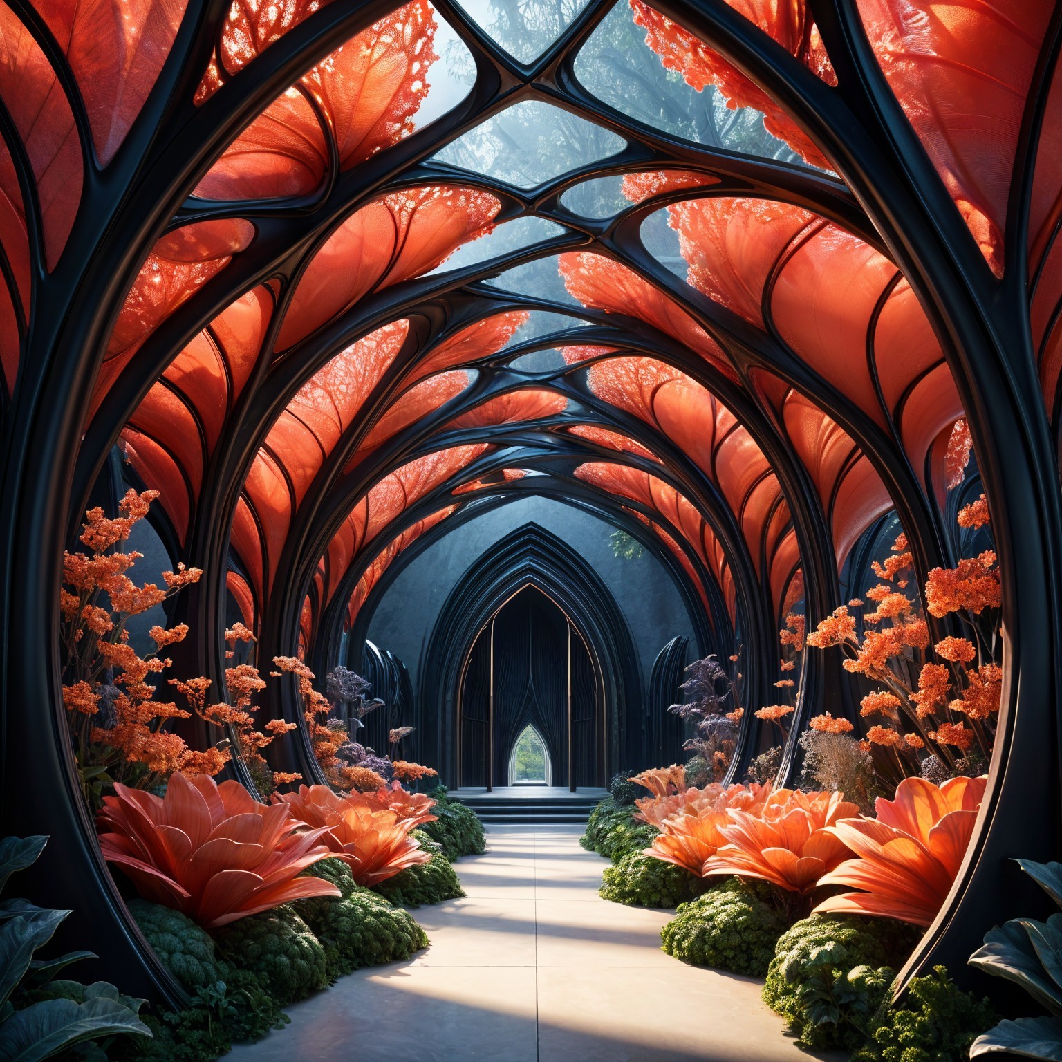 Prompt: A majestic macro vision of biological architecture forming a living 3D space. Organic and architectural structures merge into continuous hybrid forms — bat and butterfly wings evolving into petal-like membranes, flowing gothic curves, and coral textures. Feathery surfaces and translucent layers shimmer with depth and light, creating an illusion of sacred architecture grown from living matter. The scene is photorealistic, highly detailed, with soft volumetric light revealing fluid motion and intricate organic geometry — no straight lines, only harmonious, evolving forms within a luminous spatial depth.