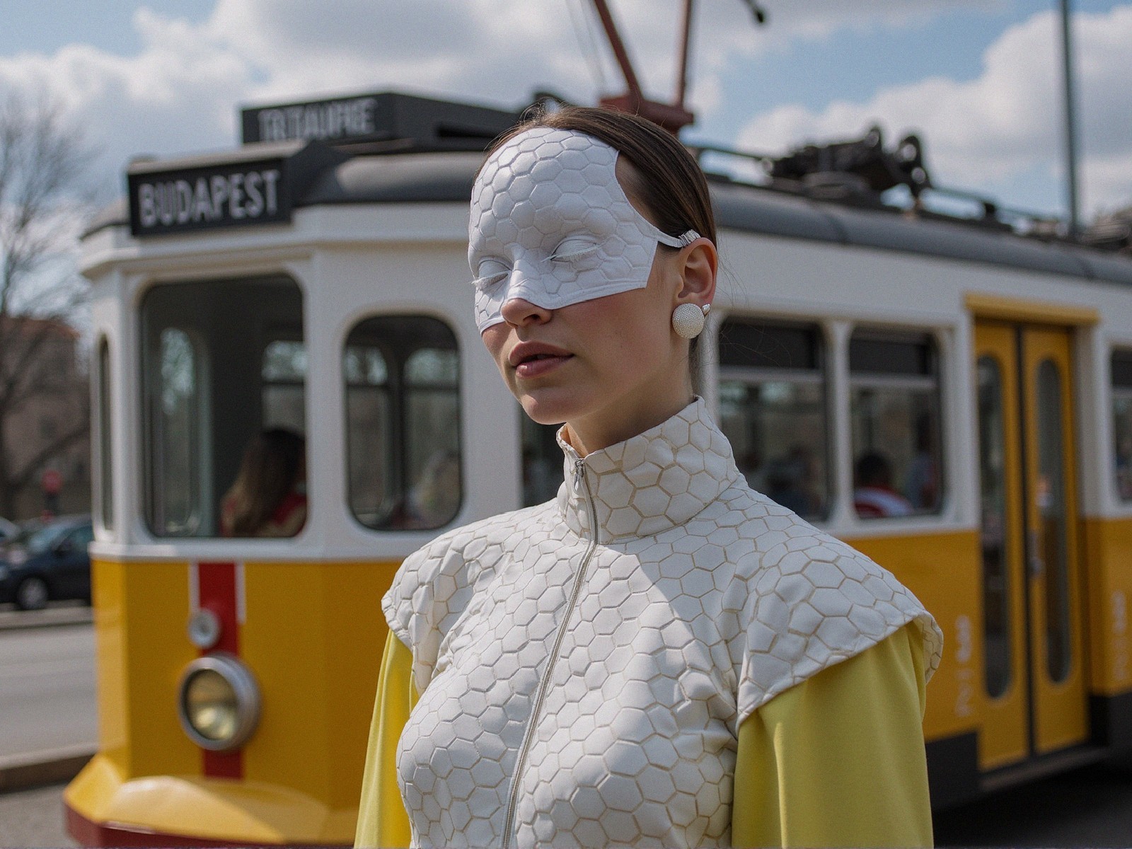 The individual in the foreground wears an avant - garde outfit composed of **hexagonal panels** that mimic the tram’s color scheme: **white on the upper torso and head** (creating a fragmented, geometric effect on the face) and **yellow on the lower torso and arms**. The panels are arranged in a honeycomb pattern, making the outfit look like a continuation of the tram’s design.