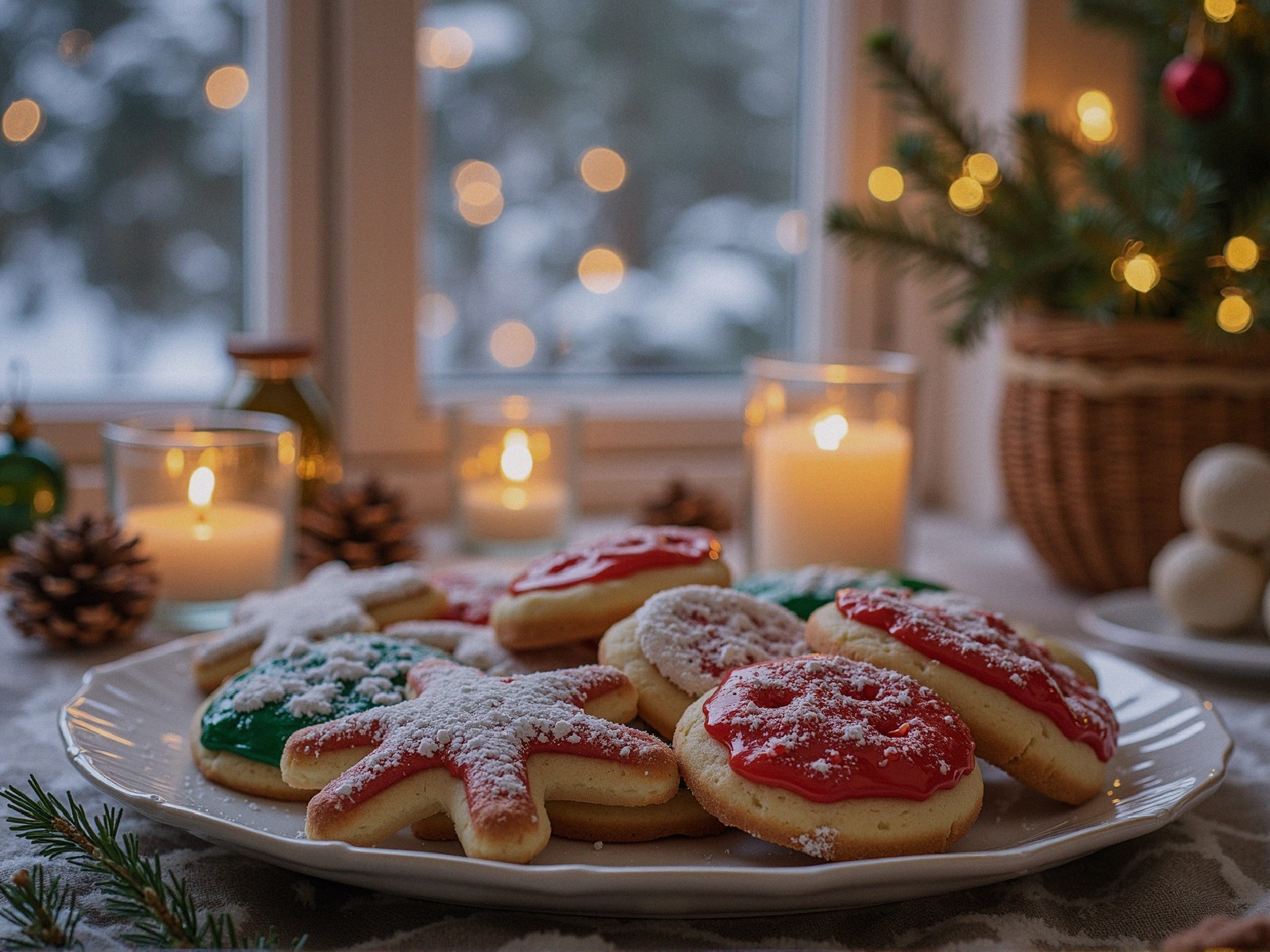 Prompt: Delicious, beautifully decorated Christmas cookies with glossy sugar glazing presented on a white plate. The scene is set in a cozy, brightly lit kitchen with a window revealing a snowy landscape outside on a winter evening. The warm interior lighting creates a soft, inviting glow