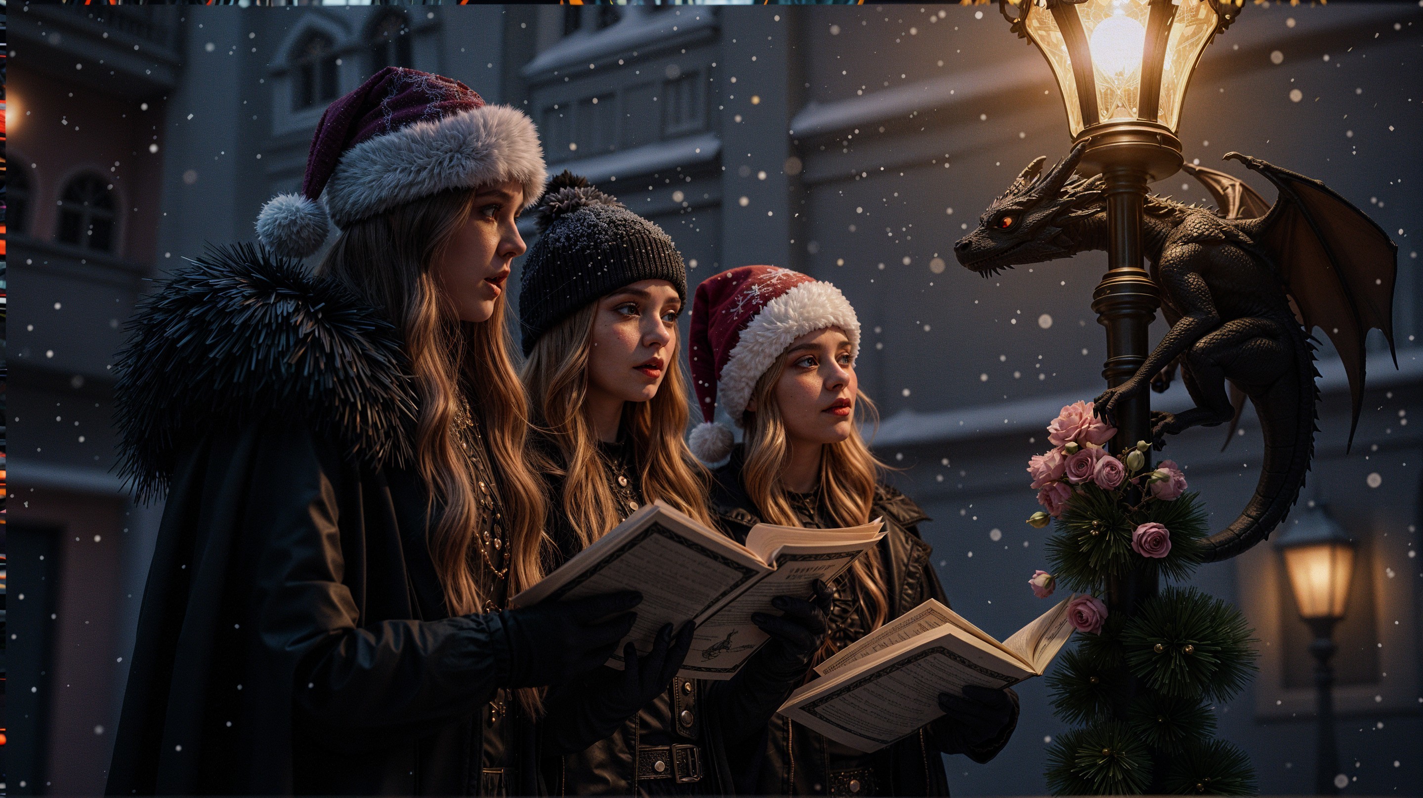 Carolers hold sheet music with ornate gothic borders, expressions emotional and harmonized, singing softly. Snow covers the ground and falls gently around them. Atmosphere deeply gothic, warm yet dark, magical, cinematic lighting, hyper-detailed realism, intricate textures, cold breath visible. Dreamlike gothic Christmas ambiance.(gothic-winter :1.2), (cyberpunk-christmas :1.0), (dragon-companion :1.1), (fantasy-realism :1.3)