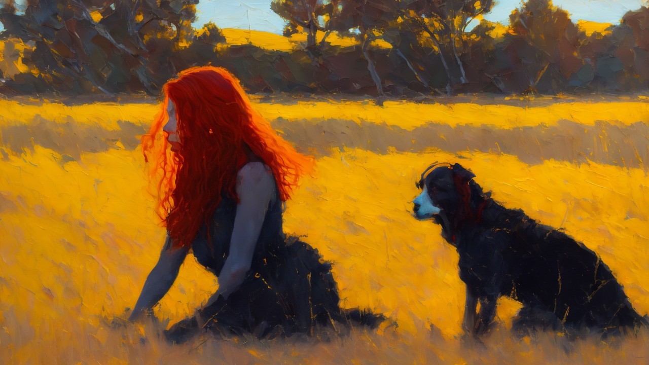Prompt: This emotionally charged oil painting captures a red-haired female figure with a dog at her side on the edge of a world of striking contrasts—bathed in golden light and swallowed by profound darkness. With expressive, dense brushstrokes, the artist shapes the woman's contemplative posture as she observes a vast, abstract yellow field. The dramatic division between the luminous foreground and the obsidian-black sky behind her evokes themes of isolation, memory, and longing. The figure, depicted in soft shades of gray, copper, and cobalt blue, radiates a quiet strength and introspection, offering an engaging visual narrative about presence and absence, hope and uncertainty.