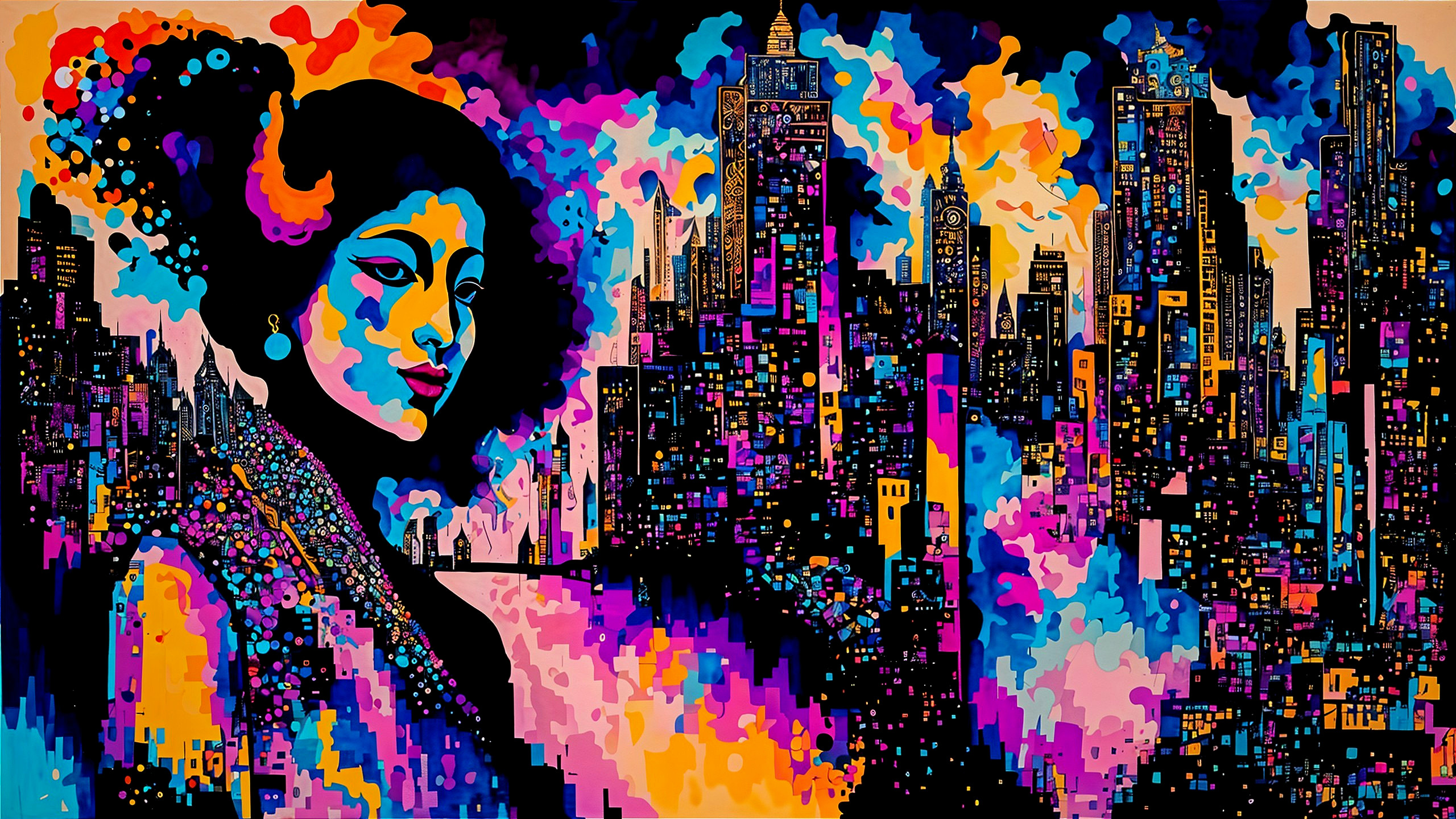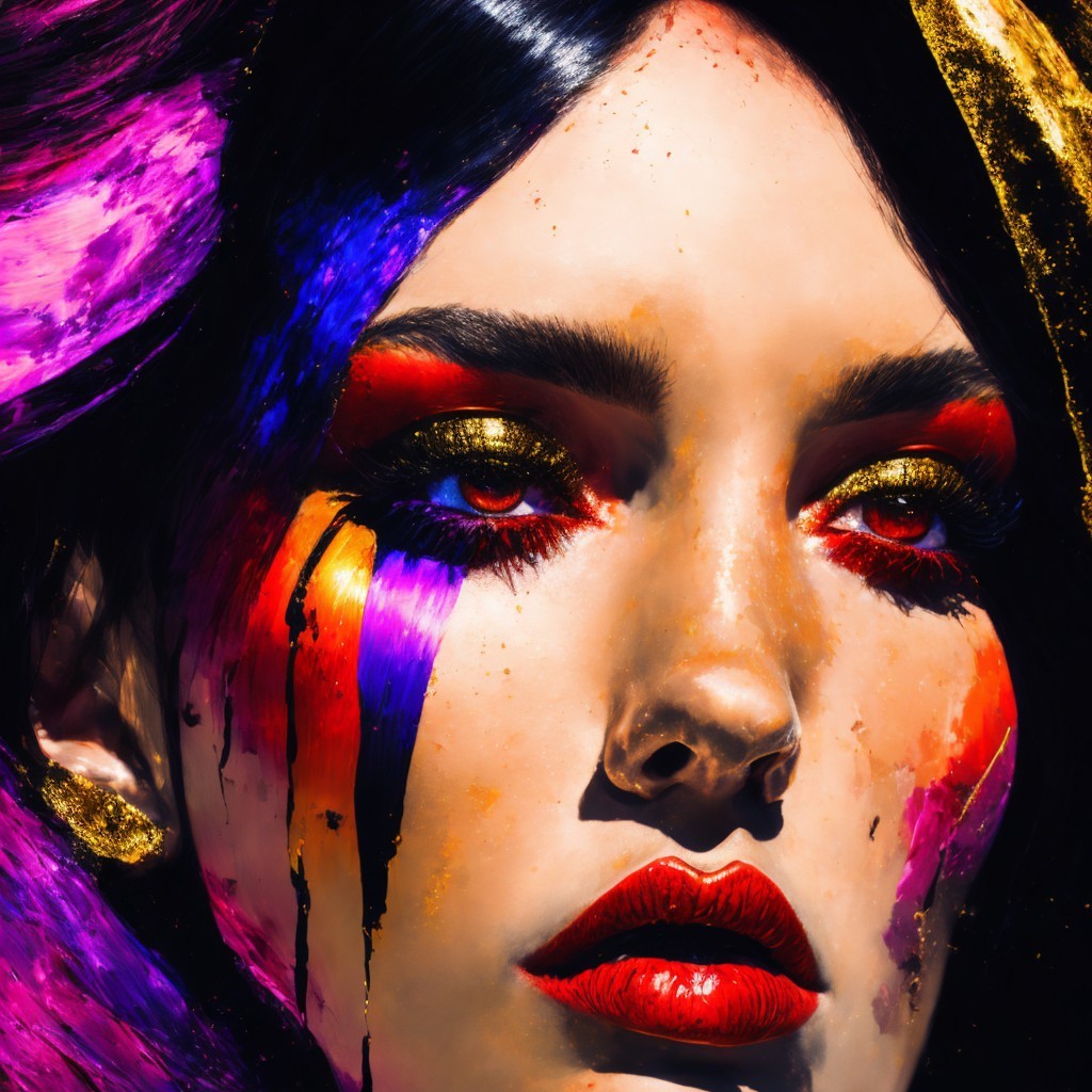 Prompt: impressive, expressive, vertical colour streaks, tones of black, gold, red and violett, palette knife art, layered textures, fragmented barely visible close up of half of a womans face