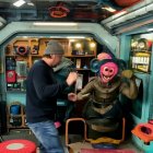 Prompt: A hauntingly surreal scene viewed from inside a dilapidated room overlooking a vibrant sunset over the ocean. The room has peeling, cracked paint on the walls, revealing underlying brickwork. A wooden table in the center is splattered with blood, forming a large, ominous pattern, with a blood-stained bottle standing upright, surrounded by scattered papers and a coffee mug. The large window frames reveal a dramatic sky with deep purple, pink, and orange hues, with dark clouds and seagulls flying across the horizon. The ocean waves crash violently onto the rocks outside, creating a foamy, tumultuous scene that contrasts with the eerie calmness inside the room. Light filters through the tattered curtains, casting shadows over the unsettling tableau.
