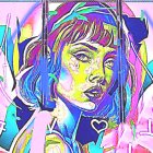 Prompt: A photo of an oil painting of an albino girl with very long hair wearing a cute rubber lolita dress. The girl has green hair and tattoos and is wearing a white shirt high collar and a pastel pink skirt with lace-up details and corset. She also wears pastel blue and pink socks and white high heel shoes. The background is a beige wall with a few nails.