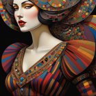 Prompt: (A colorful panoramic masterpiece, Adult, Sexy nude and Gothic pop-art style, cheerful vibrant colors), ((Golden-clad woman crouches, eyes closed, smiling softly. Ethereal light glows on dark waves of hair. Behind her, stained-glass mosaic blooms in earthy browns, yellows, and muted blues, shimmering like a dream of fractured light)), (By Joan Miró, Beksinski, Tomasz Setowski, Jacek Yerka, Amanda Clark, Aubrey Beardsley, Josephine Wall. Full Size, Full Length and Full Scale Image)
