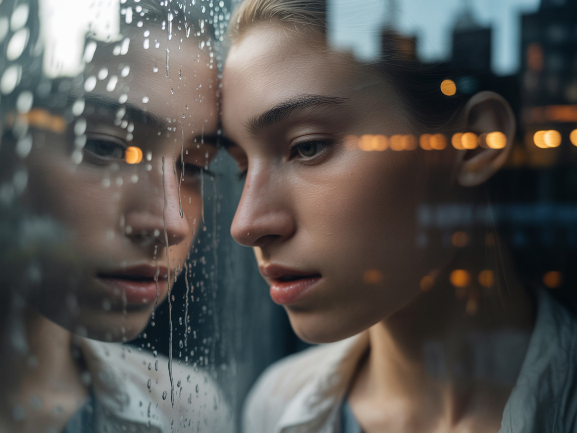 Prompt: Cheek Pressed into Rain-Streaked Window: A close-up of a face gently pressed against a windowpane streaked with rain, skin slightly compressed and blurred by the glass, droplets cascading downward.