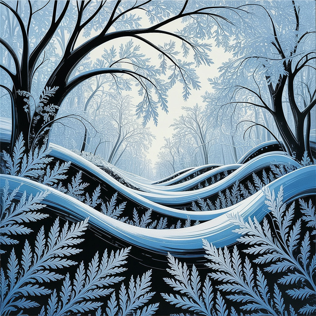 Prompt: In the style of van Gogh, Klimt, and Hundertwasser. Mixed media, patchwork: A cozy interior scene depicts a young woman sitting alone at a small, round wooden table, lost in thought. The warm, golden light from a vintage lamp beside her bathes the room in a soft glow. She has long, wavy brown hair that falls across one side of her face and a fair complexion. Her delicate features convey a gentle, thoughtful expression; she wears a blue cardigan over a white shirt, giving her a relaxed yet elegant look. In the background, a large window framed by soft curtains offers a view of a twilight scene with the faint glow of lights from houses and a snow-covered landscape—a tranquil and inviting atmosphere. On the table are a simple white cup and saucer and a small plate, suggesting that she is enjoying a warm drink. The entire color palette of the image combines cool blue tones of the twilight outdoors with warm gold and brown tones from the interior, thus reinforcing the feeling of warmth and serenity in this peaceful moment.