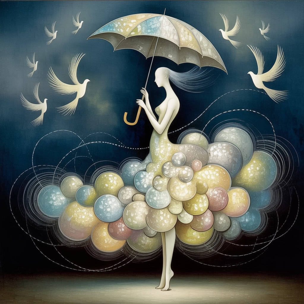 Prompt: An ethereal young female figure, composed of luminous cloud-like forms, stands centered against a deep navy blue backdrop. She holds a large umbrella, her silhouette subtly defined in a darker blue beneath its canopy. Her cloud-like skirt and the umbrella's dome are intricate mosaics of fragmented shapes in white, cream, pale yellow, and light blue, creating a shimmering, mother-of-pearl effect. Delicate white lines delineate the umbrella's structure and hang like threads from the canopy and skirt, terminating in teardrop shapes. Her legs and heeled boots emerge from the cloud mass with complex, textured fill. Several stylized white doves in flight, depicted as clean silhouettes, surround her. The textured artwork features gestural brushstrokes and multi-layered tones, mimicking abstract realism and expressionism. Diffused, low-key lighting creates a cool, mysterious shade, with glow-in-the-dark elements adding to the dark theme. Style of abstract expressionism, influenced by Cy Twombly and Anselm Kiefer.