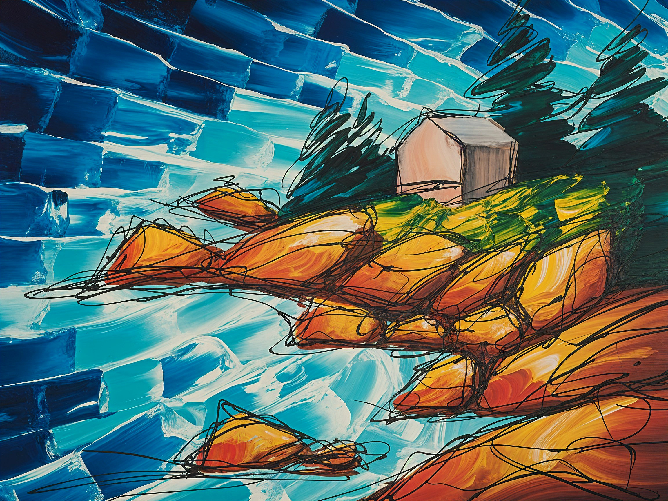 Prompt: Abstract vibrant coastal landscape inspired by a rocky seaside with a small stone house among pine trees. Use bold, saturated colors: intense blues and turquoises for the sea, warm ochres and fiery oranges for the rocks, lush bright greens and yellows for vegetation, with bursts of pinks and reds as accents. Thick impasto knife strokes creating energetic, fragmented shapes. The house appears as a simplified geometric block with strong edges. Pine trees reduced to swirling silhouettes with expressive knife movements. Add Ink linework to outline key abstract forms—rocks, house, tree trunks—using fluid, dynamic strokes that contrast with the heavy textures. Overall feel: luminous, colorful, modern and semi-chaotic, with rhythmic patterns and intense light