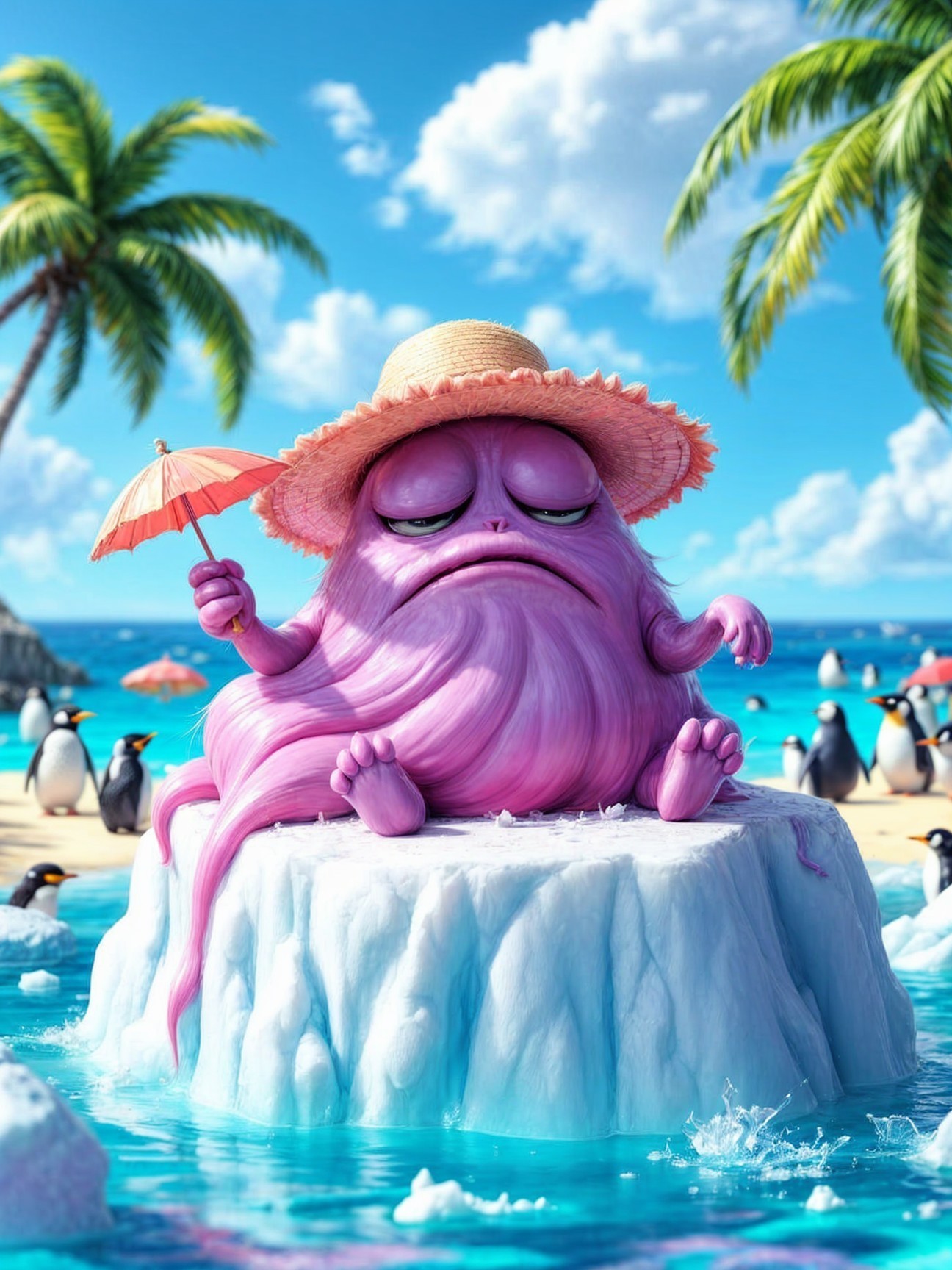 Prompt: A realistic fluffy, lavender-colored slime monster, wearing a ridiculously small sun hat and clutching a tiny cocktail umbrella, is attempting to sunbathe on a microscopic iceberg. It looks thoroughly unimpressed with the frigid surroundings. The backdrop is a vibrant, tropical beach filled with confused penguins. Style: A charmingly absurd, brightly colored cartoon style with a surreal, playful twist, evoking the lighthearted chaos of Ren & Stimpy's animation.
