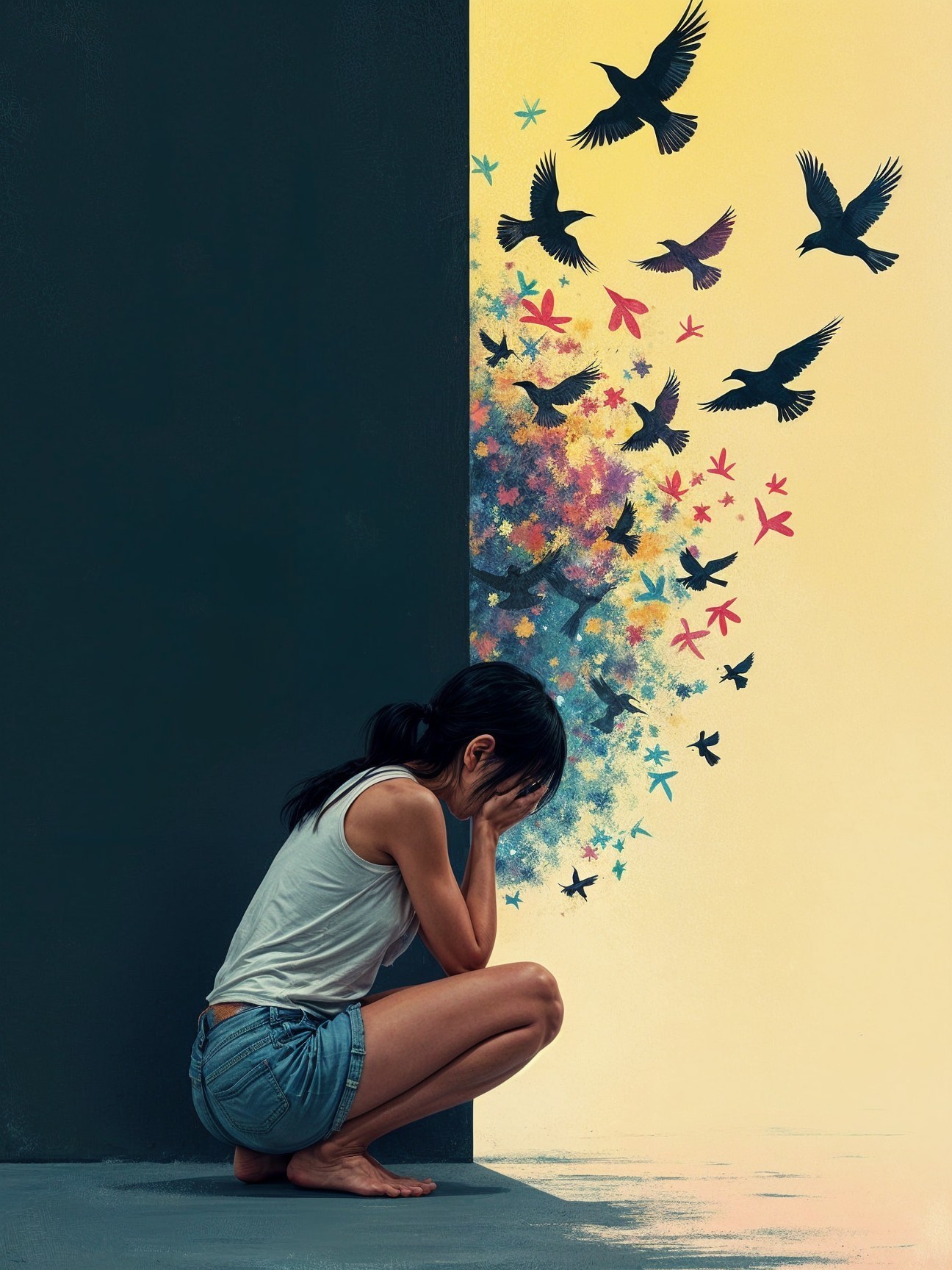 Prompt: Soft Cubism, roses, sun shading and regional nuances, very thick rough brush strokes, half-erased effect, blurred, Red, black, lavender, brown,"Create a captivating, realistic portrait in a modern, bohemian, high-fashion style. Depict a lovely young woman with long, straight dark brown hair and a very narrow waist. Capture her in a graceful, full-body standing pose. Her skin has a soft, glossy, oiled sheen. She wears a unique multi-element outfit: high-waisted, extremely wide-leg, flowing palazzo pants made from a fabric with a multi-colored tie-dye pattern in shades of blue, pink, and yellow. Paired with a simple, fitted, black, off-the-shoulder, long-sleeved crop top. An ornate, golden belt cinches her very narrow waist. She wears numerous layered gold necklaces with large, blue stone pendants.\n\nThe background is a soft, abstract, out-of-focus and atmospheric painting, with textures of yellow, pink, and brown. The scene is lit by a warm, golden backlight. The scene is captured in a photorealistic style with ultra-detailed, high-resolution clarity. Incorporate elements of medieval, baroque, and renaissance aesthetics, emphasizing féminité and grâce. Add glamour and aesthetic inspiration from Soufiane Idrassi and Edwardian Avant Garde fashion.\n\nFor an additional layer of complexity, imagine a vibrant and colorful bohemian fashion photoshoot featuring a woman wearing a stunning turquoise dress with intricate floral embroidery and beadwork. The dress is adorned with detailed patterns in pink, orange, and green hues, with tassels and lace trimming adding to the elegant design. She is accessorized with large turquoise statement earrings and a multicolored beaded necklace.\n\nHer hair is styled in a voluminous updo decorated with bold orange and pink flowers, complemented by green feathers. The setting features a pastel turquoise background with a rustic door, creating a tropical and artistic atmosphere. The overall mood is lively, exotic, and full of intricate details, with a sensual mood and soft lighting.\n\nApply an infrared filter (1.8) to enhance the glamorous and aesthetic appeal. Ensure the final image is a masterpiece, best quality, with a captivating portrait revealing clothes, sensual, and a low-key background. The overall ambiance should evoke magic and enchantment, capturing the essence of féminité and sensual allure."
