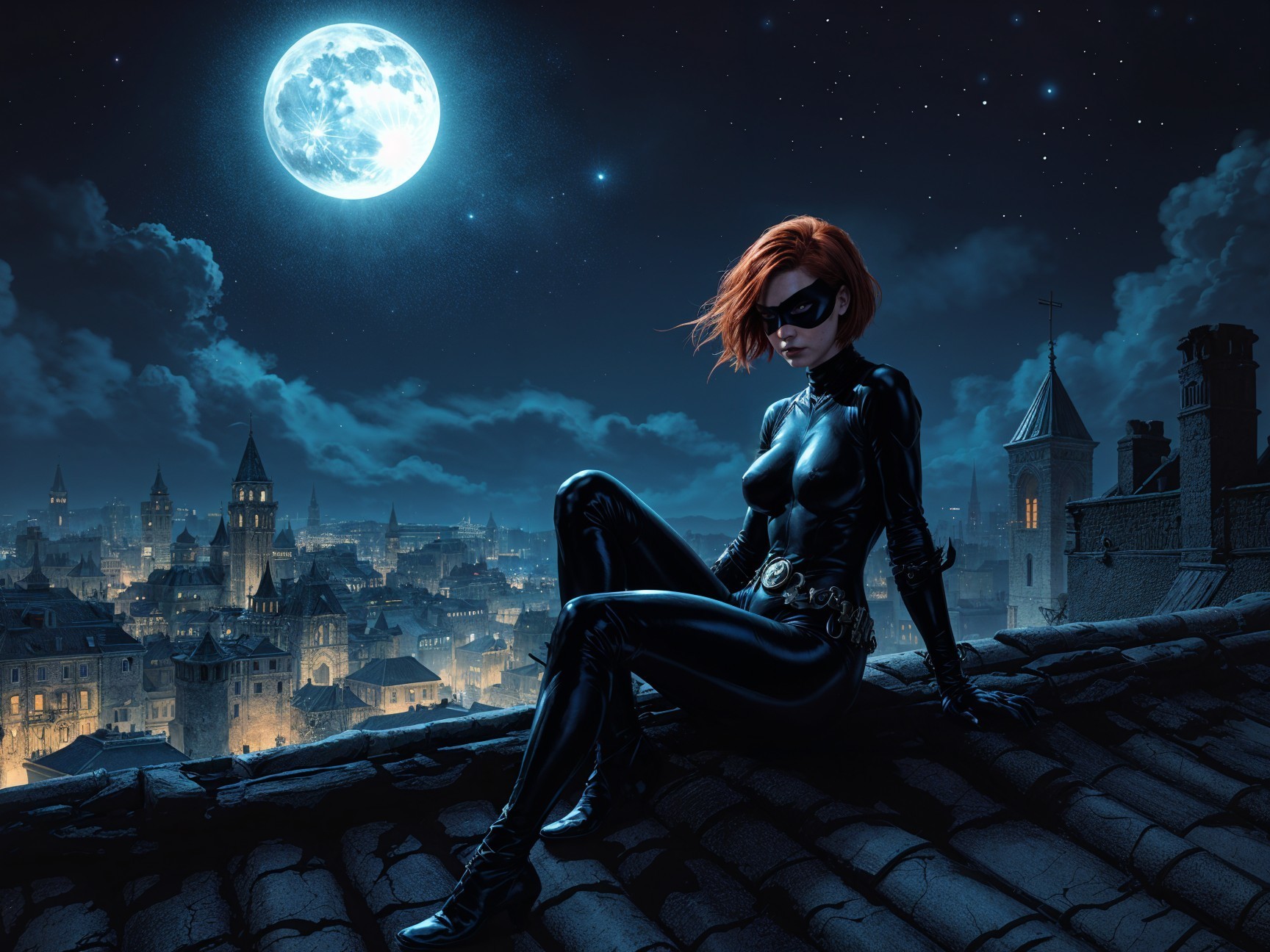 Prompt: Legendary scene of Santa and his Gothic Reindeer flying across a starless, brooding midnight sky, full moon glowing behind them like a halo. EMO-goth reinterpretation: black leather harnesses with ripped fabric straps, silver chains, studs, piercings, detailed lacework, dark ornamental carvings. Reindeer have long flowing emo-styled fur, dark smudged tones, glowing red nose on the lead reindeer. Santa redesigned as a gothic–punk icon: long black coat, purple accents, belts, chains, fingerless gloves, emo hair streaks, dark glasses reflecting moonlight. The sleigh drips with gothic ornamentation, sharp silhouettes, purple flame-like magical aura under the runners. Atmospheric magical particles, shimmering embers, soft ethereal fog. Photorealism + digital fantasy art with deep emotion, melancholic beauty, dreamy darkness. Rembrandt light direction + cinematic backlight.