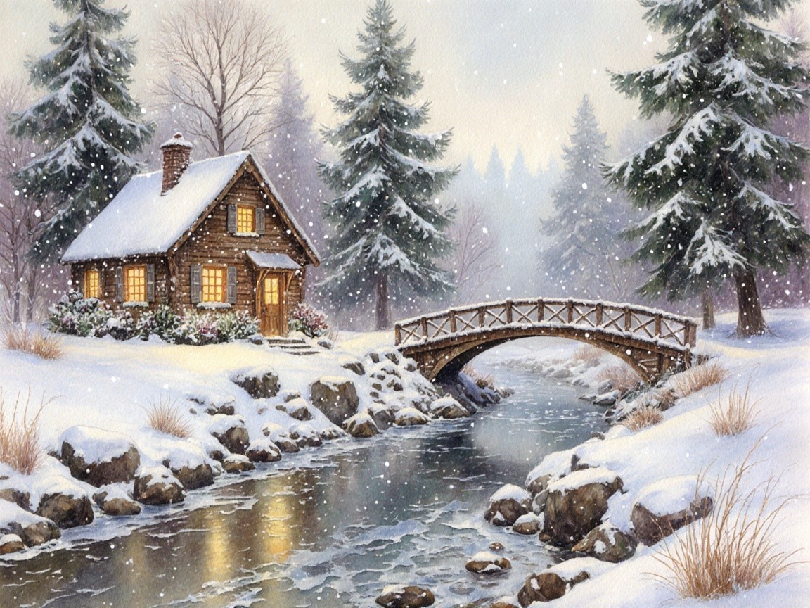 Prompt: Create a winter scene featuring a cozy, snow-covered house in a picturesque setting. The house, a charming wooden structure, has a steeply pitched roof blanketed in thick snow and adorned with icicles hanging from the edges. There are large, warmly lit windows that emit a golden glow, suggesting warmth and comfort inside. The front door is a vibrant red, adding a splash of color against the snowy backdrop.style by John Atkinson Grimshaw × Thomas Kinkade