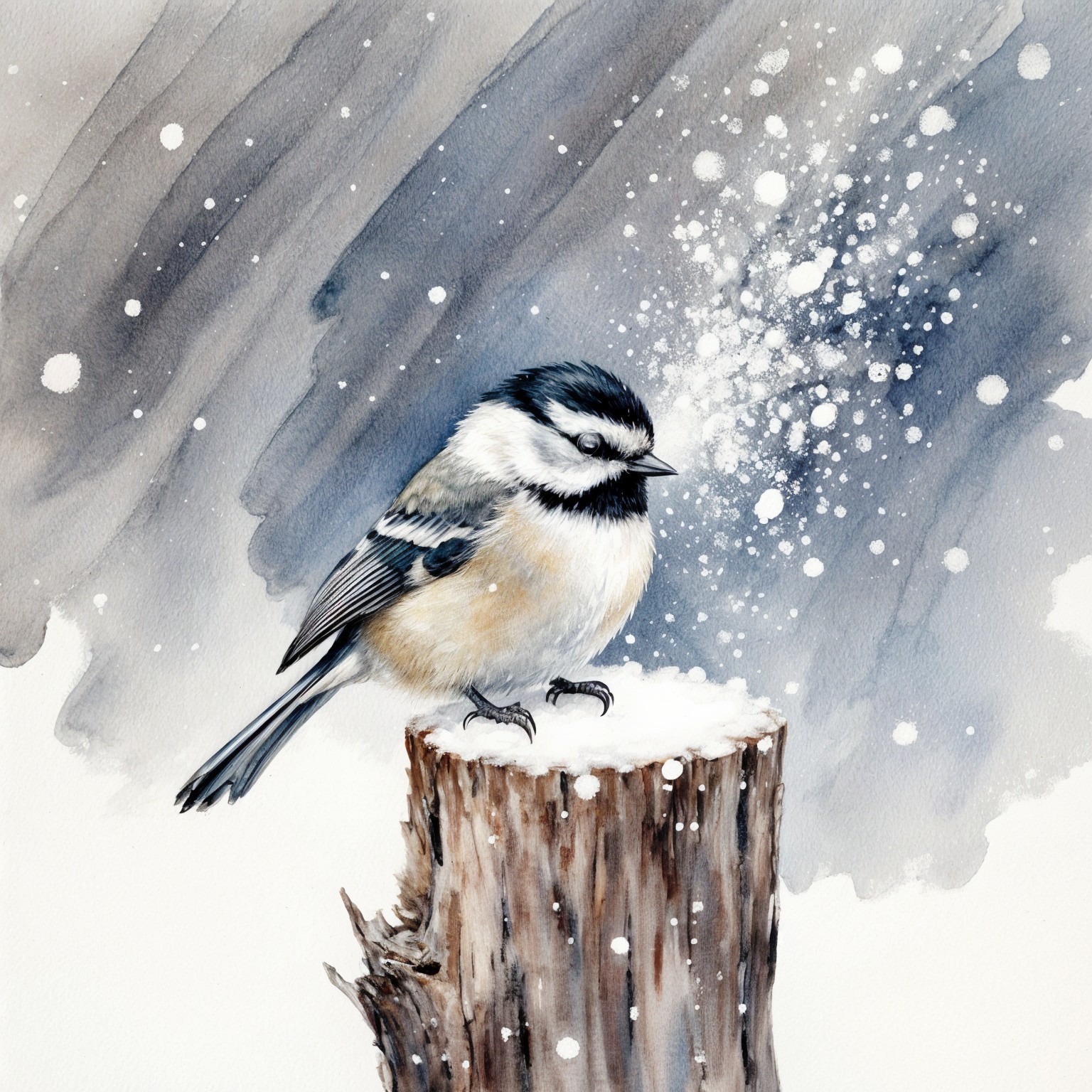 Prompt: Depict a small Chickadee Bird perched on the edge of a tree stump during a fierce snowstorm. Strong winds blow snow directly into its face. The bird sits with its eyes closed and head bowed, as if trying to keep warm. Its tiny body appears slightly puffed to retain heat. The background is abstract, with wavy strokes of watercolor in cold shades of gray, blue, and white, softly dissolving at the edges. The painting exudes melancholy and elegance, evoking a sense of vulnerability and winter's cold.