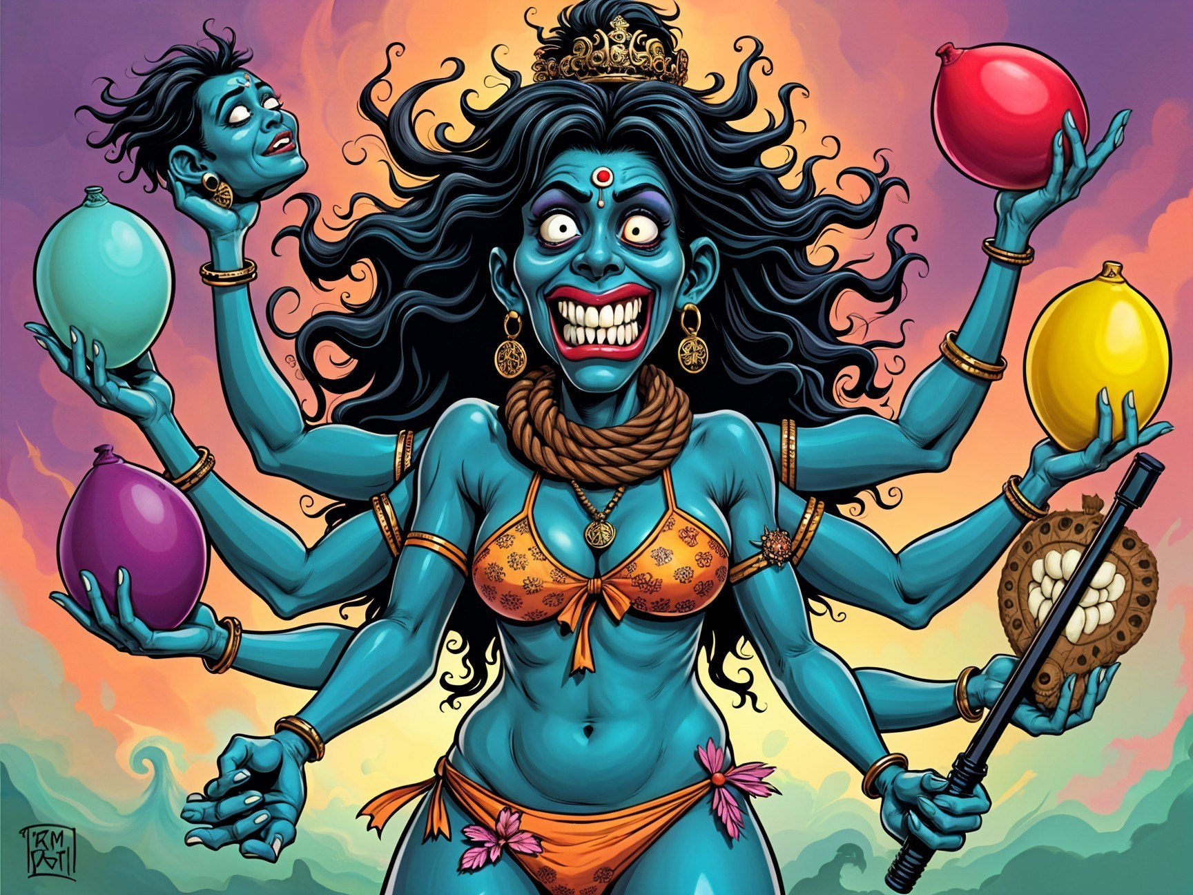 Prompt: "A satirical, dark comedy cartoon of the Hindu goddess Kali, rendered in a style blending l caricature and surreal humor, with detailed linework and vibrant colors. Kali, depicted in a bright