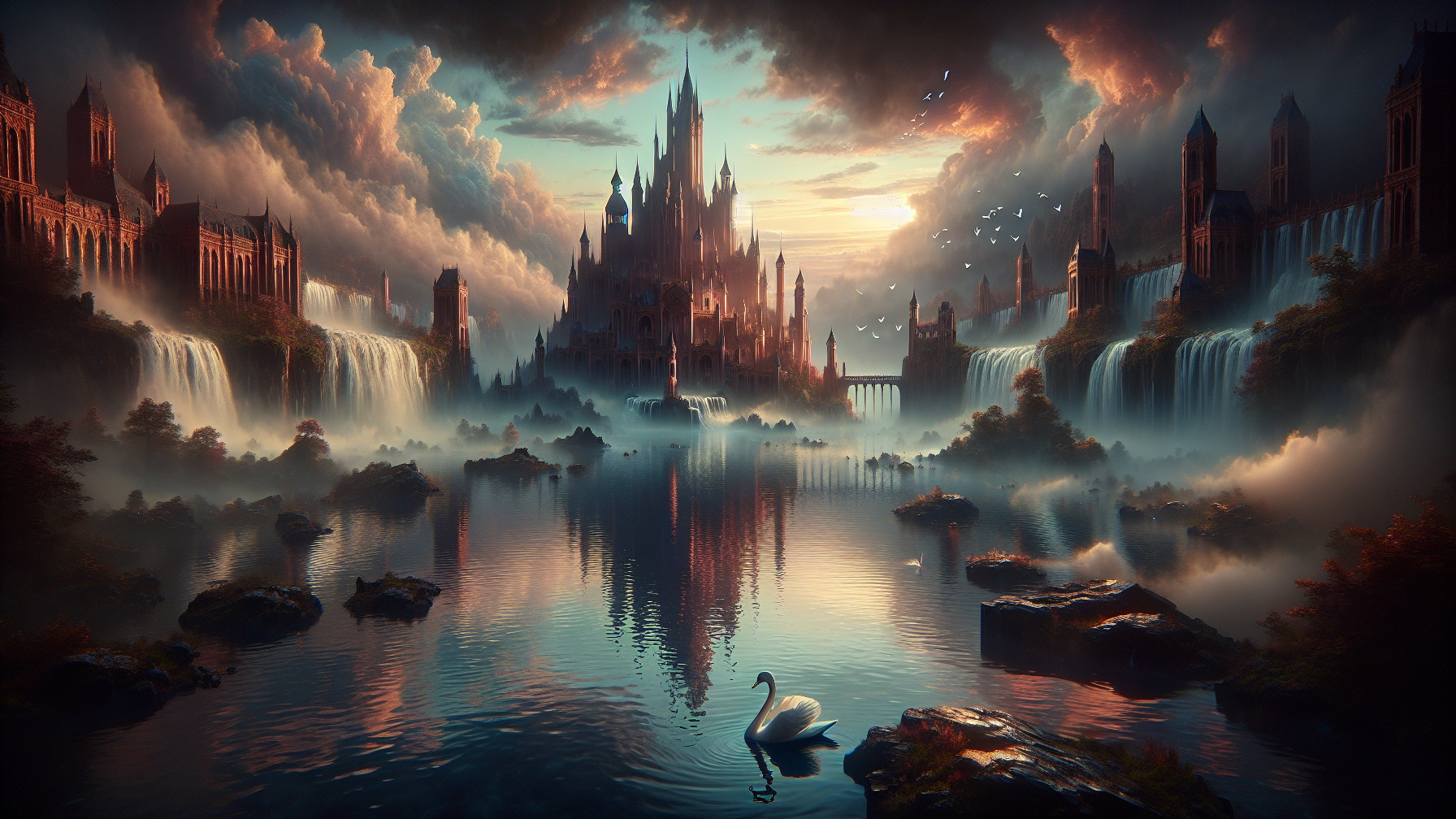 Prompt: A misty morning, a big lake, a swan. A magnificent castle on calm reflective waters. The reddish-brown castle with tall spires and intricate towers. The scene with cascading waterfalls under a dreamy, dawn sky. The atmosphere feels magical and otherworldly, with glowing colors, high detail, and a cinematic fantasy style. Brutal 3D style, inspired by the works of Greg Rutkowski and Zdzisław Beksiński, drawing the viewer into a mystical realm, where the ordinary dissolves into the extraordinary, dark fantasy aesthetic, cinematic lighting, and volumetric fog.