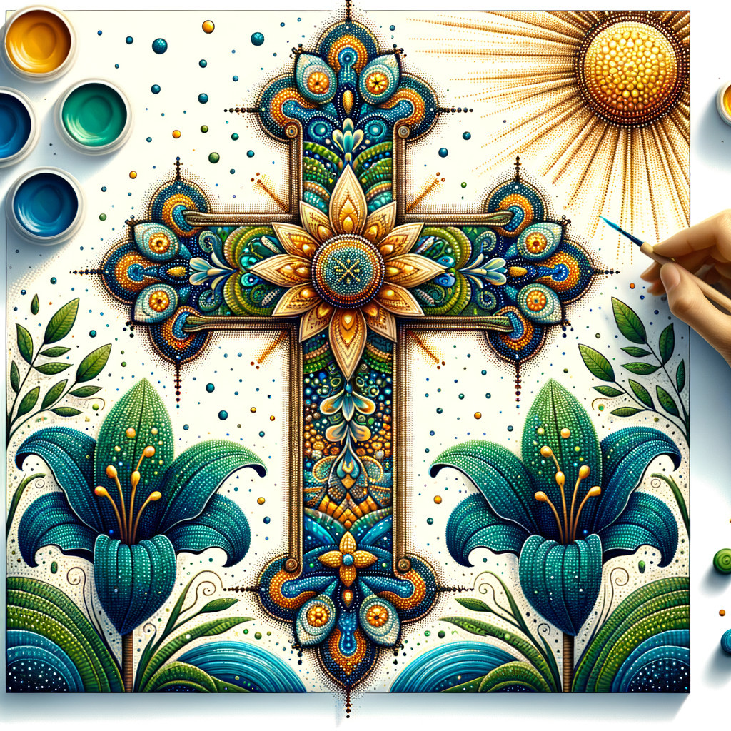 Prompt: Realistic painted artwork of a dot mandala cross on a white background.